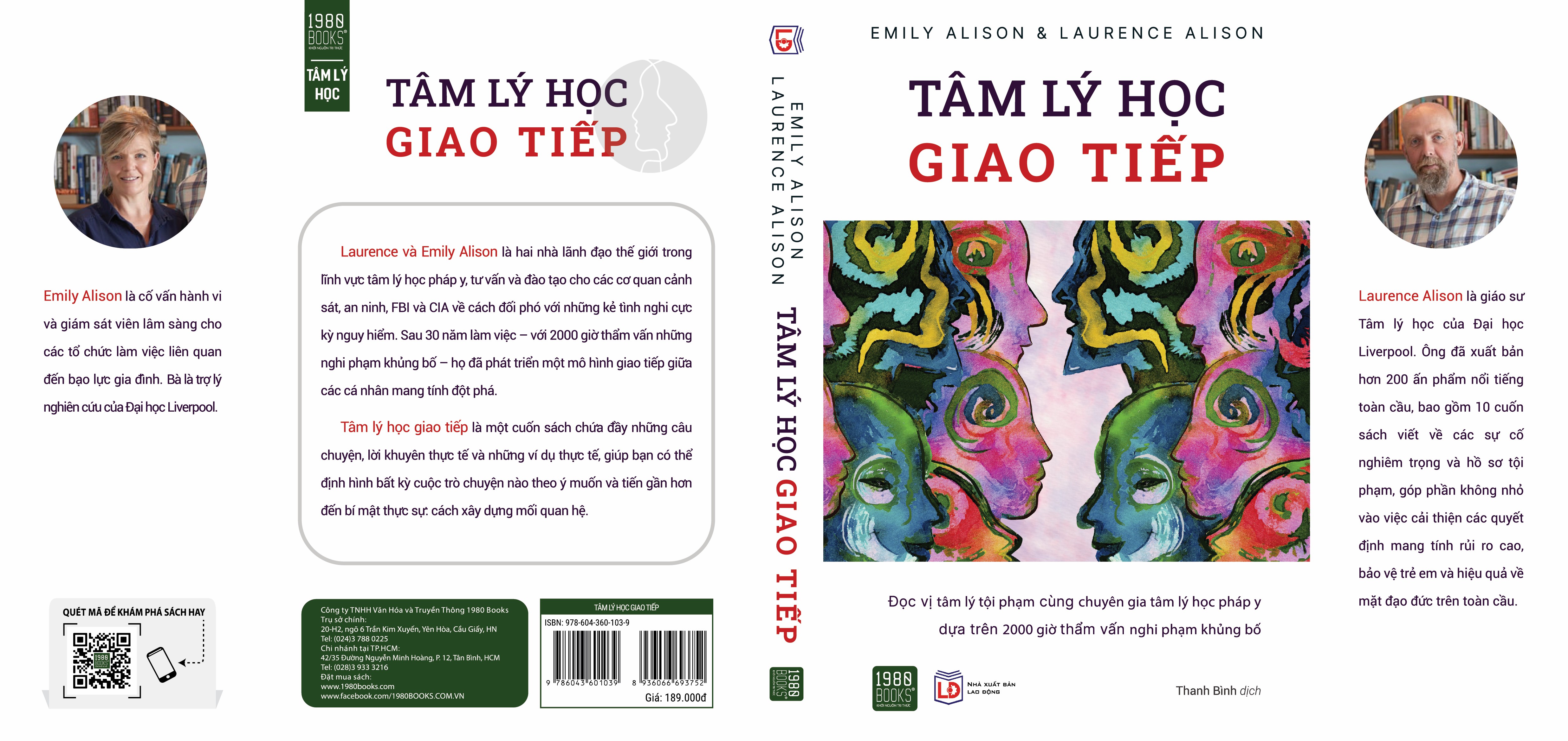 • Thông tin tác giả Emily Alison là cố vấn hành vi kiêm giám sát viên lâm sàng cho các tổ chức làm việc liên quan đến bạo lực gia đình. Bà là trợ lý nghiên cứu của Đại học Liverpool. Laurence Alison là giáo sư Tâm lý học của Đại học Liverpool. Ông đã xuất bản hơn 200 ấn phẩm nổi tiếng toàn cầu gồm 10 cuốn sách viết về các sự cố nghiêm trọng và hồ sơ tội phạm, góp phần không nhỏ vào việc cải thiện các quyết định mang tính rủi ro cao, bảo vệ trẻ em và hiệu quả về mặt đạo đức trên toàn cầu. Laurence và Emily Alison là hai nhà lãnh đạo thế giới trong lĩnh vực tâm lý học pháp y, tư vấn và đào tạo cho các cơ quan cảnh sát, an ninh, FBI và CIA về cách đối phó với những kẻ tình nghi cực kỳ nguy hiểm. Sau 30 năm làm việc – với hơn 2000 giờ thẩm vấn các nghi phạm khủng bố – họ đã phát triển được một mô hình giao tiếp liên nhân vô cùng đột phá. Lời khen tặng: “Laurence Alison là một trong những người hùng học thuật của tôi. Anh ấy đã làm được điều mà mọi nhà văn đều khao khát làm được. Anh ấy đơn giản hóa mọi khó khăn mà không làm mất đi sự nghiêm khắc của anh ấy. Đây là một cuốn sách đáng đọc.”