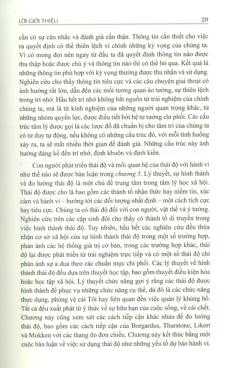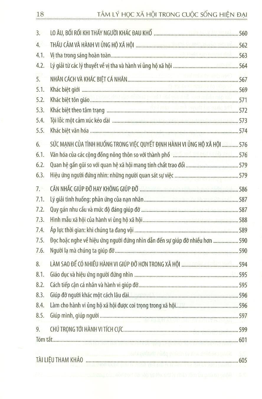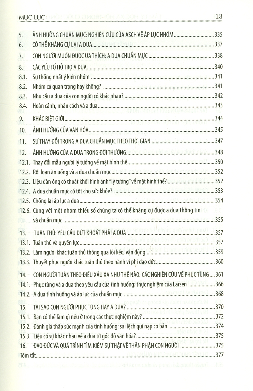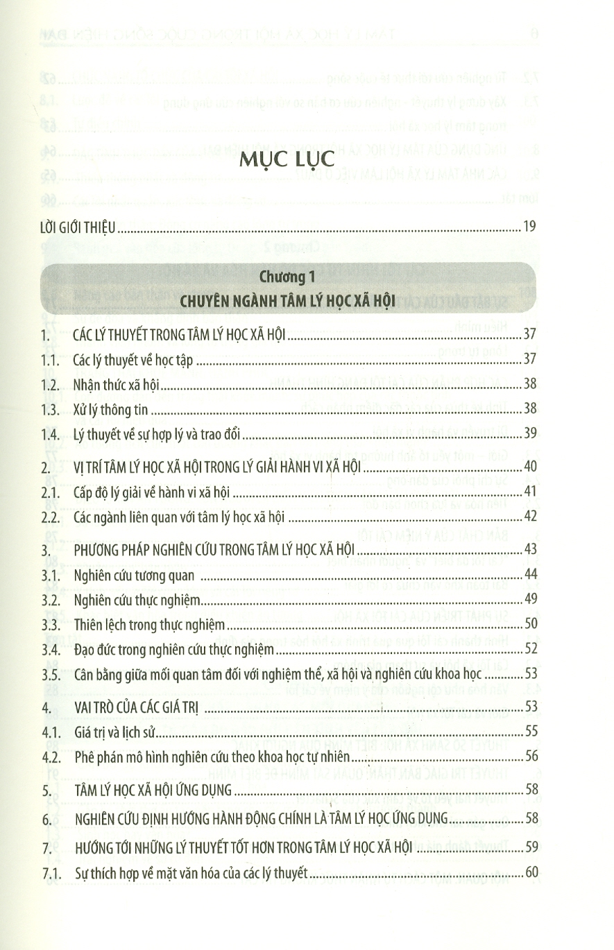 Chương 1: chuyên ngành tâm lý học xã hội Chương 2: Cái tôi nhìn từ góc độ văn hóa và xã hội Chương 3: Sự hấp dẫn và các mối quan hệ: từ gắn bó đầu đợi đến tình yêu lưá đôi Chương 4: Nhận thức xã hội: Chúng ta nghĩ về cuộc sống xã hội như thế nào Chương 5: Thái độ và hành vi Chương 6: Ảnh hưởng nhóm Chương 7: Quá trình ảnh hưởng xã hội: A dua, tuân thủ và phục tùng Chương 8: Thuyêt phục Chương 9: Hành vi liên nhóm thù địch: Định kiến, định khuôn và thù địch Chương 10: Xâm kích: sợ chỉ xuyên suốt nhân loại Chương 11: Vị tha và hành vi ủng hộ xã hội