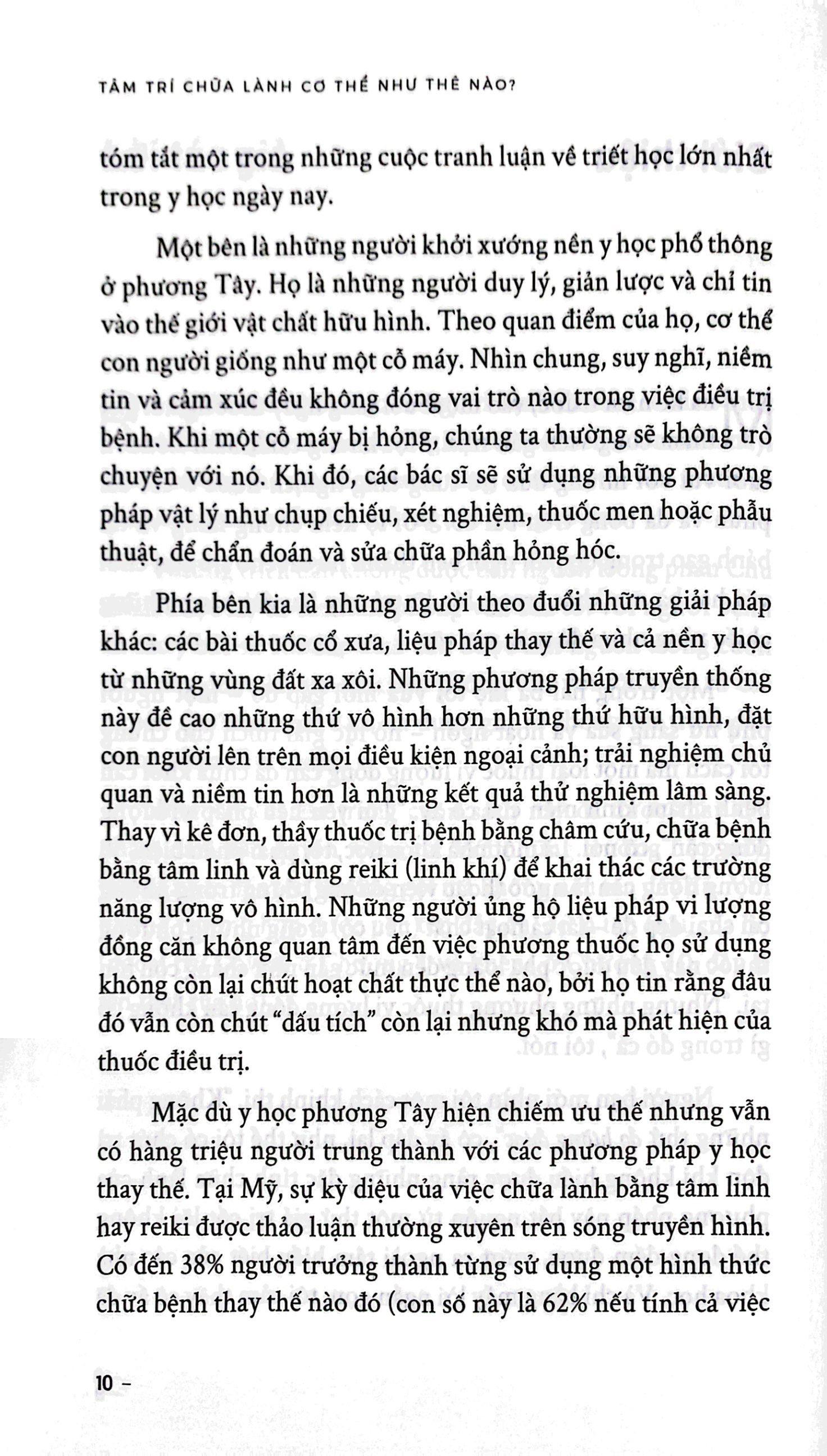 Khi bàn về vấn đề sức khỏe, nền khoa học và y học phổ thông có xu hướng lờ đi hoặc xem nhẹ vai trò của tâm trí đối với cơ thể. Tuy nhiên càng ngày càng có nhiều nhà khoa học tìm ra bằng chứng cho thấy: suy nghĩ, cảm xúc và niềm tin của chúng ta thực sự có thể xoa dịu nỗi đau và chữa lành vết thương. Chúng thậm chí còn giúp ta chống nhiễm trùng, bệnh tim, hay làm chậm sự tiến triển của bệnh AIDS và một số bệnh ung thư.