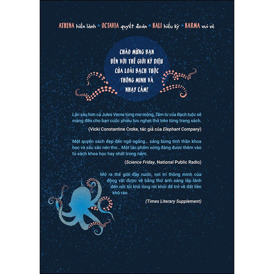 - An American Library Association Notable Book of the Year Từ bể thủy sinh ở New England đến các rạn san hô ở Polynesia và vịnh Mexico, nhà tự nhiên học nổi tiếng Sy Montgomery không ngừng theo đuổi loài bạch tuộc săn mồi hoang dã và đơn độc; cô kết bạn với những con bạch tuộc có tính cách đặc biệt ấn tượng, và quan sát mỗi sinh vật này sử dụng trí thông minh để giải quyết các vấn đề trong môi trường sống của chúng. "Nhưng trong số tất cả sinh vật trên hành tinh có năng lực tưởng tượng những thứ trong đầu sinh vật khác, loài thực hiện tốt nhất có lẽ là bạch tuộ Một con bạch tuộc phải thuyết phục nhiều loài săn mồi và con mồi rằng nó thực sự là thứ gì đó khác. Nhìn xem! Mình là một đốm mực. Không, mình là san hô này! Không, mình là tảng đá cơ! Bạch tuộc phải đánh giá xem liệu con vật kia có tin vào mưu mẹo của nó hay không, nếu không, thử cách khác ngay." -- (trích đoạn) “Đối xử với mỗi con bạch tuộc giống như từng nhân vật trong tiểu thuyết của Jane Austen”. - Vox “Mở ra thế giới đầy nước, nơi trí thông minh của động vật được vẽ bằng thứ ánh sáng lấp lánh đến nỗi tôi khó lòng rời khỏi để trở về đất liền khô ráo”. - Times Literary Supplement Thông tin tác giả Sy Montgomery là một nhà tự nhiên học, nhà biên kịch và là tác giả của 28 tựa sách nổi tiếng dành cho người lớn và thiếu nhi. Một số tựa sách nổi bật của bà: The Good Good Pig, Spell of the Tiger, Journey of the Pink Dolphin, Kakapo Rescue, How to Be a Good Creature.