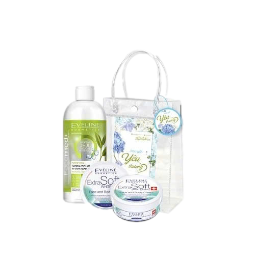 Bộ quà gồm: + Kem dưỡng Eveline Extrasoft trắng da vùng mặt và toàn thân 200ml + Toner Eveline Facemed+ kiềm dầu với khoáng chất Magma 400M Bộ quà dưỡng da Eveline (Kem dưỡng toàn
