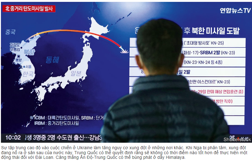 Flashpoints to watch . Sự tập trung cao độ vào cuộc chiến ở Ukraine làm tăng nguy cơ xung đột ở những nơi khác. Khi Nga bị phân tâm, xung đột đang nổ ra ở sân sau của nước này. Trung Quốc có thể quyết định rằng sẽ không có thời điểm nào tốt hơn để thực hiện một động thái đối với Đài Loan. Căng thẳng Ấn Độ-Trung Quốc có thể bùng phát ở Himalay.