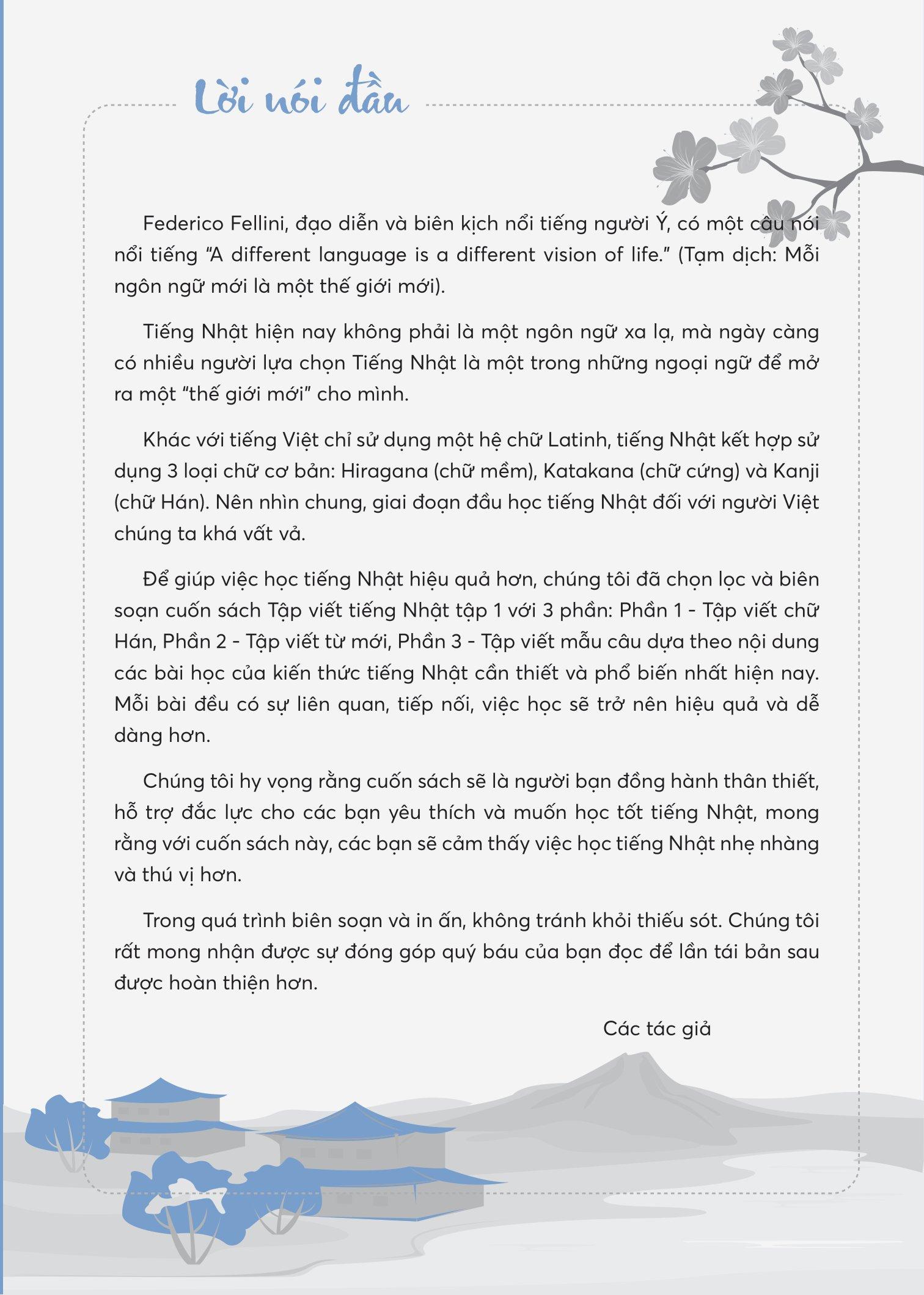Cuối cùng, hy vọng rằng cuốn sách này sẽ là người bạn đồng hành thân thiết, hỗ trợ đắc lực cho các bạn yêu thích và muốn học tốt tiếng Nhật, giúp cho con đường theo đuổi đam mê của mọi người nhẹ nhàng và trở nên thú vị hơn. Chúc các bạn học tốt
