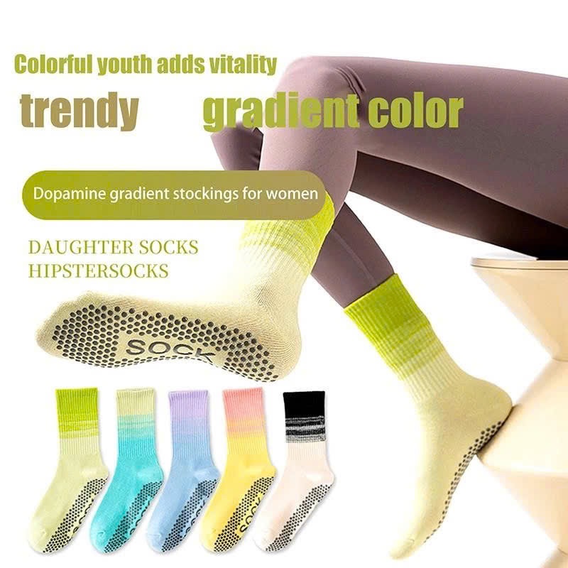 Đế tất được làm từ các hạt PVC chống trượt, có chức năng đệm, hấp thụ sốc và xoa bóp lòng bàn chân tránh bị trượt. Mang tất chống trượt năm ngón của chúng tôi sẽ khiến bạn cảm thấy tự tin, thời trang và được bảo vệ.
