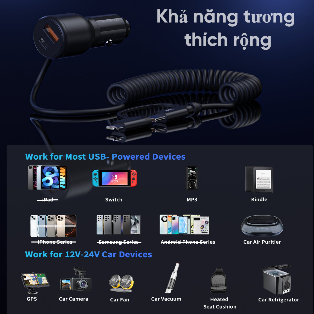 - Trọng lượng: Khoảng 60gr Thông tin chi tiết Công suất tổng lên đến 110W – Sạc cực nhanh, không chờ đợi – Tẩu sạc được trang bị tổng công suất lên đến 110W, cho phép sạc nhanh cùng lúc nhiều thiết bị như smartphone, tablet, i-Pad, laptop mỏng nhẹ, tai nghe… – 1 cổng Power Delivery (PD) hỗ trợ sạc nhanh công suất cao, phù hợp với cả iP, i-Pad, Mac-Book Air, điện thoại And-roid đời mới. Tích hợp dây lò xo Type-C + Đầu chuyển IP – Linh hoạt mọi thiết bị – Dây sạc lò xo Type C được thiết kế dài 1.5m, co giãn linh hoạt, tiện lợi cho cả hàng ghế trước và sau. – Đi kèm đầu chuyển IP, tương thích với các thiết bị Ap-ple (iP, i-Pad). Trang bị 2 cổng USB-A – Kết nối đa dạng, chia sẻ dễ dàng – 2 cổng USB-A với khả năng nhận diện thiết bị thông minh, cung cấp dòng sạc ổn định và nhanh chóng cho điện thoại, máy chơi game, camera hành trình và nhiều phụ kiện khác. Thiết kế tiện lợi & an toàn – Vỏ ngoài bằng nhựa ABS + PC cao cấp, chống cháy và tản nhiệt tốt. – Đèn LED hiển thị trạng thái hoạt động rõ ràng, sang trọng. Tương thích rộng rãi – Hoạt động tốt với mọi dòng xe hơi có cổng tẩu (DC 12V – 24V). – Sạc được cho điện thoại And-roid/iOS, i-Pad, tai nghe không dây, camera hành trình, thiết bị GPS và nhiều thiết bị di động khác. Hình ảnh Tẩu sạc nhanh 2 cổng trên ô tô 110W Choetech TC0038 tích hợp cáp lò xo Type C kèm đầu nối IP dài 1.5M (Hàng chính hãng)
