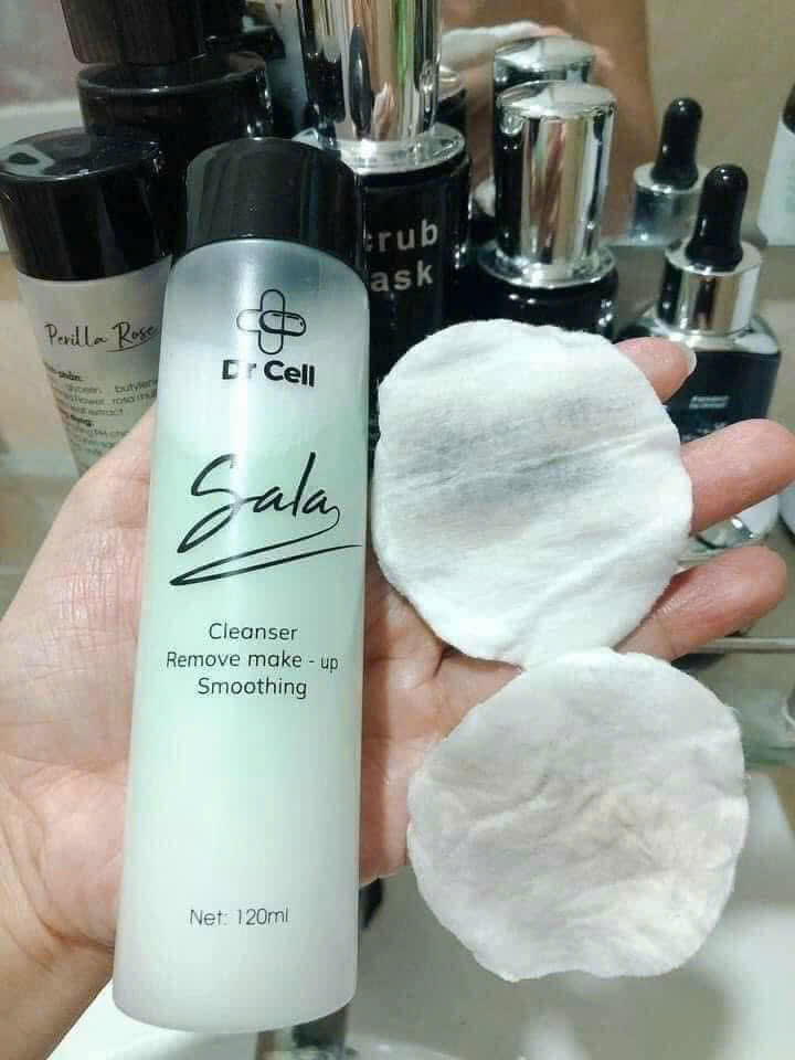 Mua tại TiktokTẩy Trang 2 Tầng Sala Dr Cell 120ml THÀNH PHẦN: Cyclopentasiloxane ,Isohexadecane Bufy-lene Glycol, Sodium Chioride, Isopropyl Myristate, Disodium EDTA, Dầu hương thảo, Dâu tràm trà, bạc hà, dầu cọ. CÔNG DỤNG: - Loại bỏ được các độc tố trên da, tránh hiện tượng nhiễm chì, nhiễm hóa chất khi sử dụng mỹ phẩm độc hại. - Loại bỏ cặn bã mỹ phẩm hay các sản phẩm make - up trên da. - Làm sạch da tối đa nhưng không gây khô da. - Hỗ trợ ngăn ngừa và giảm mụn ẩn, mụn chỉ, mụn đầu trắng. CÁCH DÙNG: Lắc đều chai trước khi sử dụng Cho dung dịch ra miếng bông tẩy trang và lau toàn bộ khắp mặt. Nên lau nhẹ mắt, môi rồi đến các vùng khác. Rửa mặt lại với Sữa Rửa Mặt