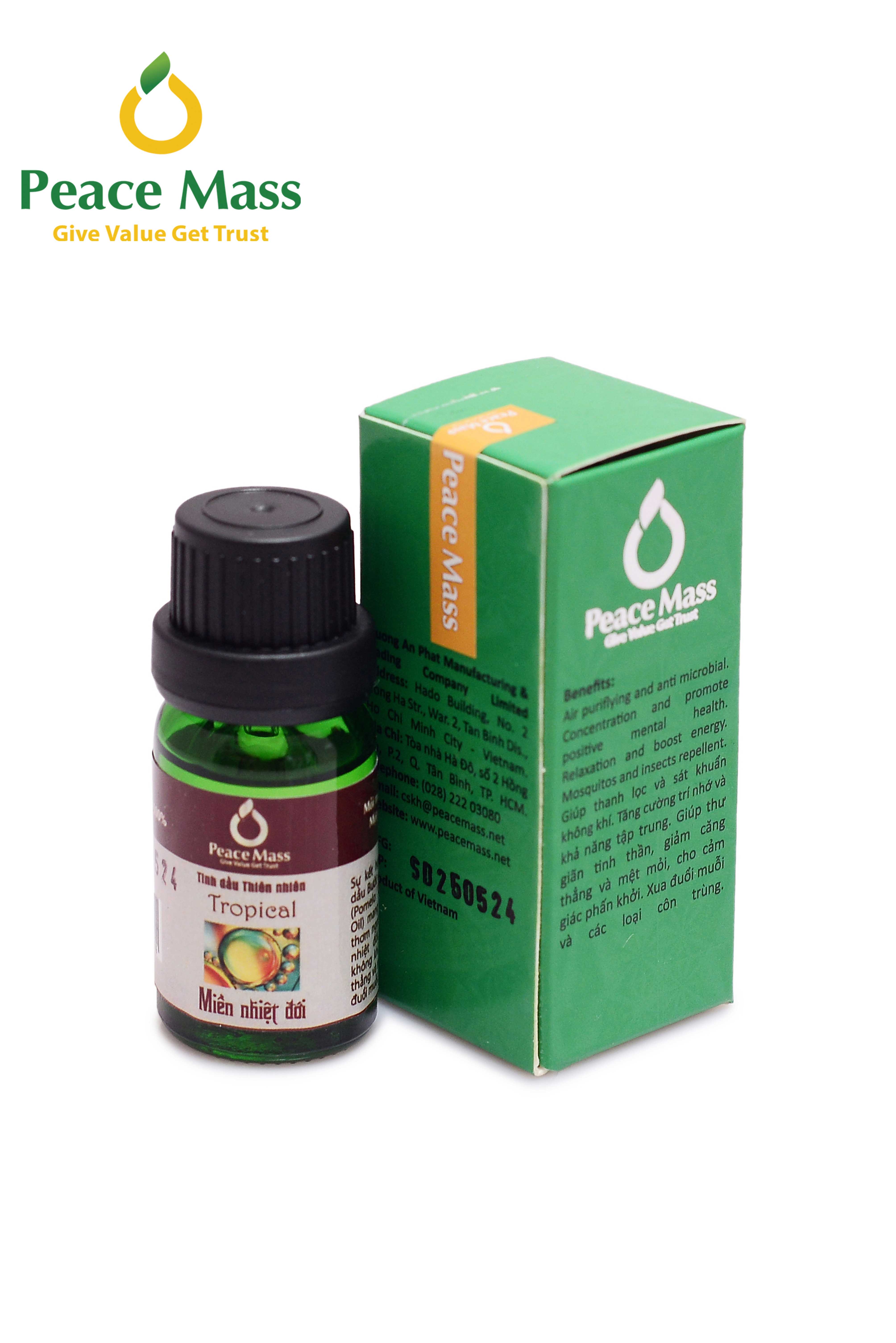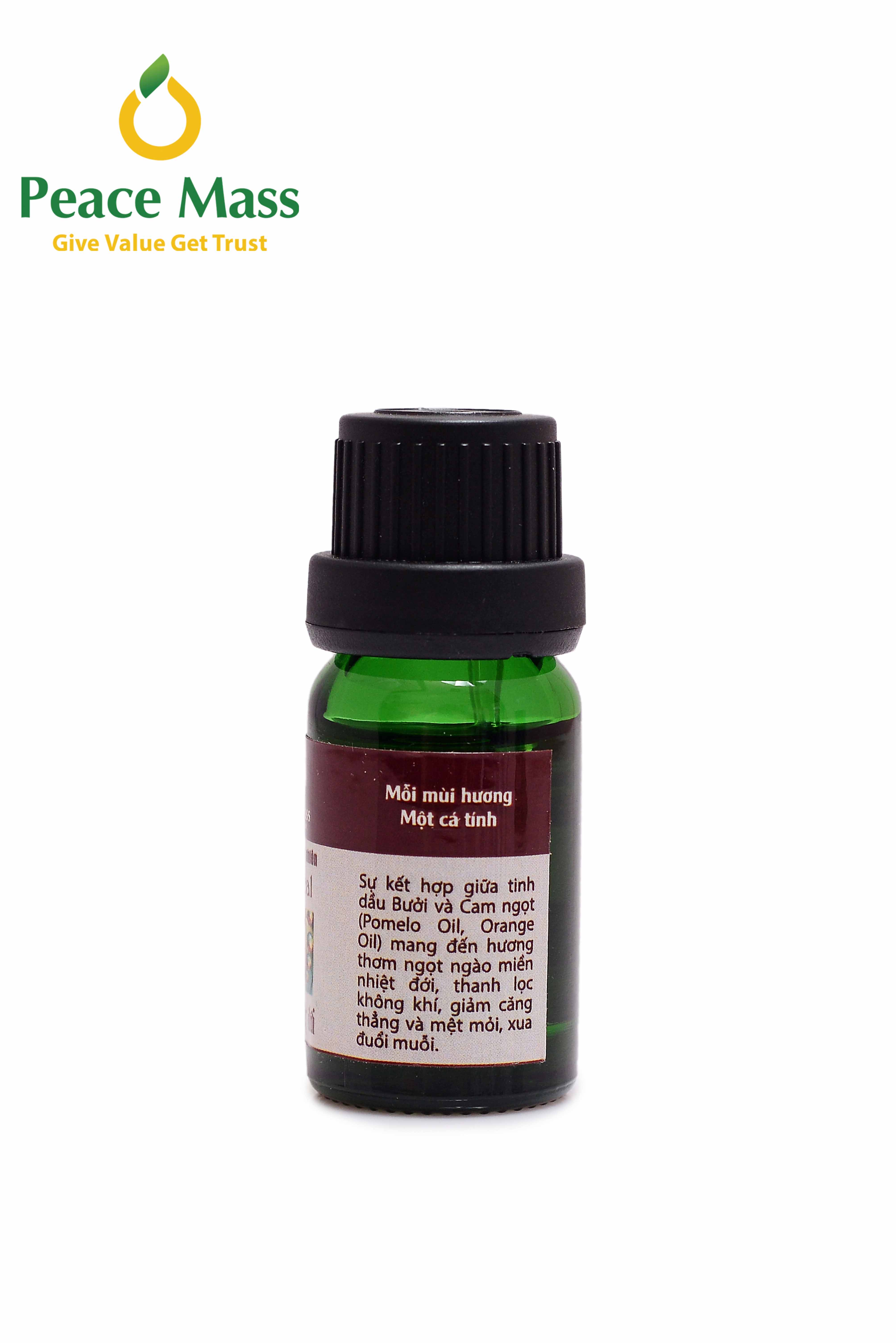 Tinh dầu Miền nhiệt đới Peace Mass dùng cho máy xông 10ml là sự kết hợp giữa tinh dầu Bưởi và Cam ngọt (Pomelo Oil, Orange Oil) mang đến hương thơm ngọt ngào miền nhiệt đới, thanh lọc không khí, giảm căng thẳng và mệt mỏi, xua đuổi muỗi.