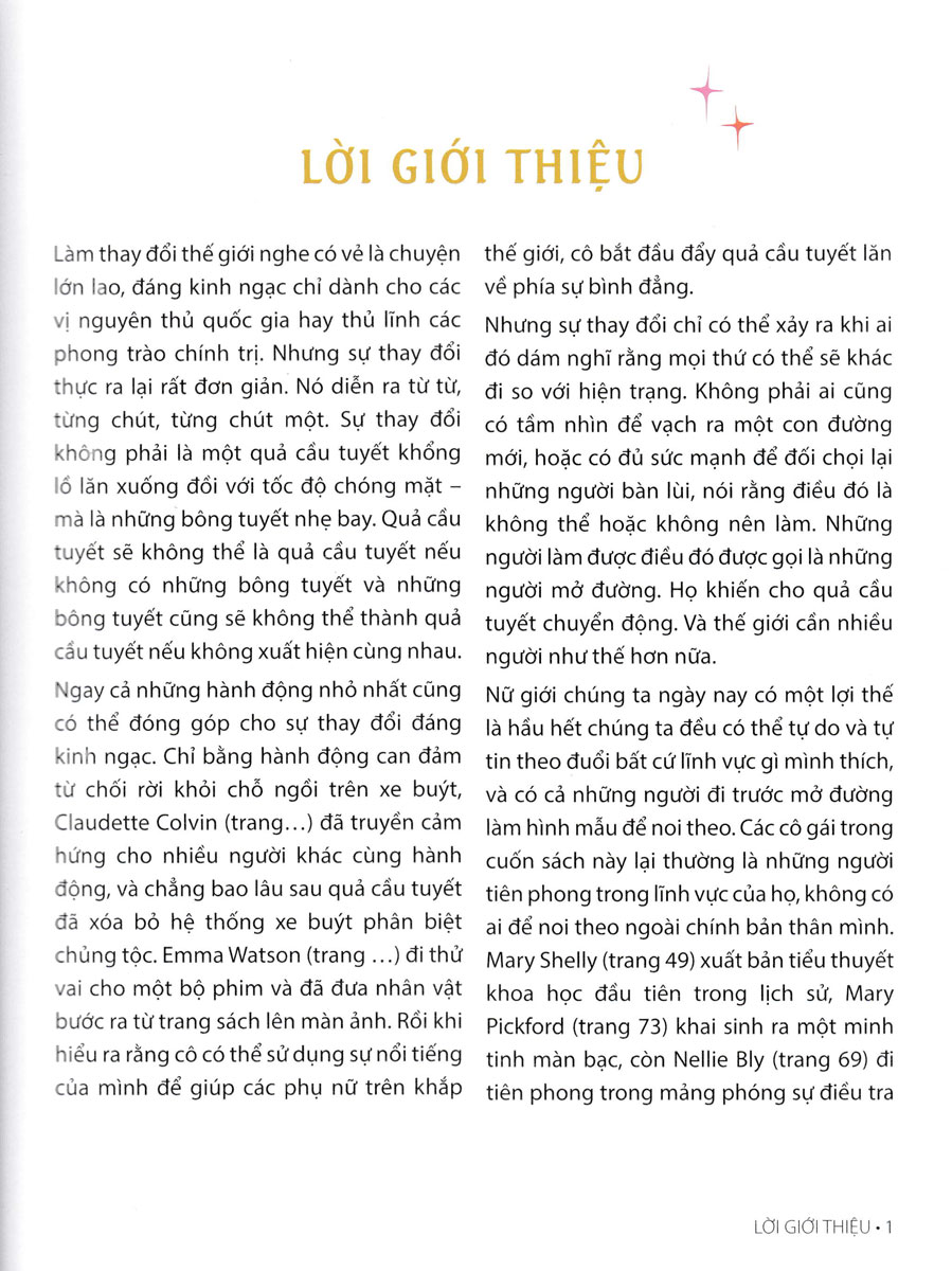Ngày nay chúng ta may mắn: hầu hết phụ nữ có được sự tự do và sự tự tin để đi theo bất cứ hướng nào mình thích. Chúng ta cũng có những người đi trước làm hình mẫu. Họ đã mở đường cho chúng ta. Nhưng các cô gái trong cuốn sách này thường là những người tiên phong trong lĩnh vực của họ, không có ai để noi theo ngoài chính bản thân mình. Mary Shelly xuất bản tiểu thuyết khoa học đầu tiên trong lịch sử, Mary Pickford tạo ra một ngôi sao điện ảnh, còn Nellie Bly đi tiên phong trong mảng phóng sự điều tra – tất cả đều sống trong kỷ nguyên mà phụ nữ được bảo phải ngồi yên và không được lên tiếng. Xã hội không kỳ vọng nhiều ở những cô gái này, vậy nên họ phải kỳ vọng nhiều hơn từ chính bản thân mình. Mặc dù chúng ta đã đi được một chặng đường dài, vẫn cần có sự tiến tới và và vẫn có những con đường cho những nhà tiên phong tuổi “teen” mới dấn bước.