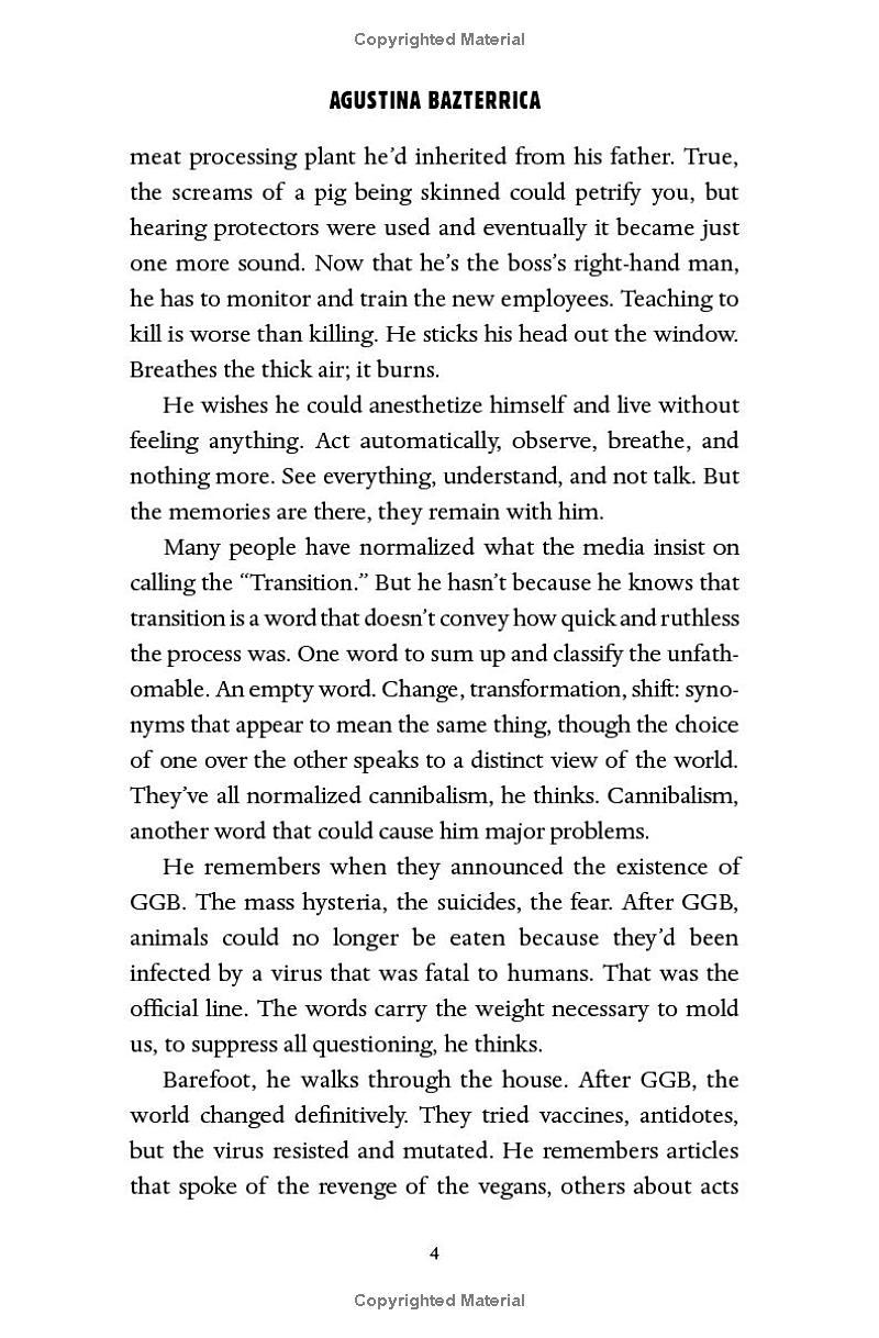 His wife has left him, his father is sinking into dementia, and Marcos tries not to think too hard about how he makes a living. After all, it happened so quickly. First, it was reported that an infectious virus has made all animal meat poisonous to humans. Then governments initiated the “Transition.” Now, eating human meat—“special meat”—is legal. Marcos tries to stick to numbers, consignments, processing.