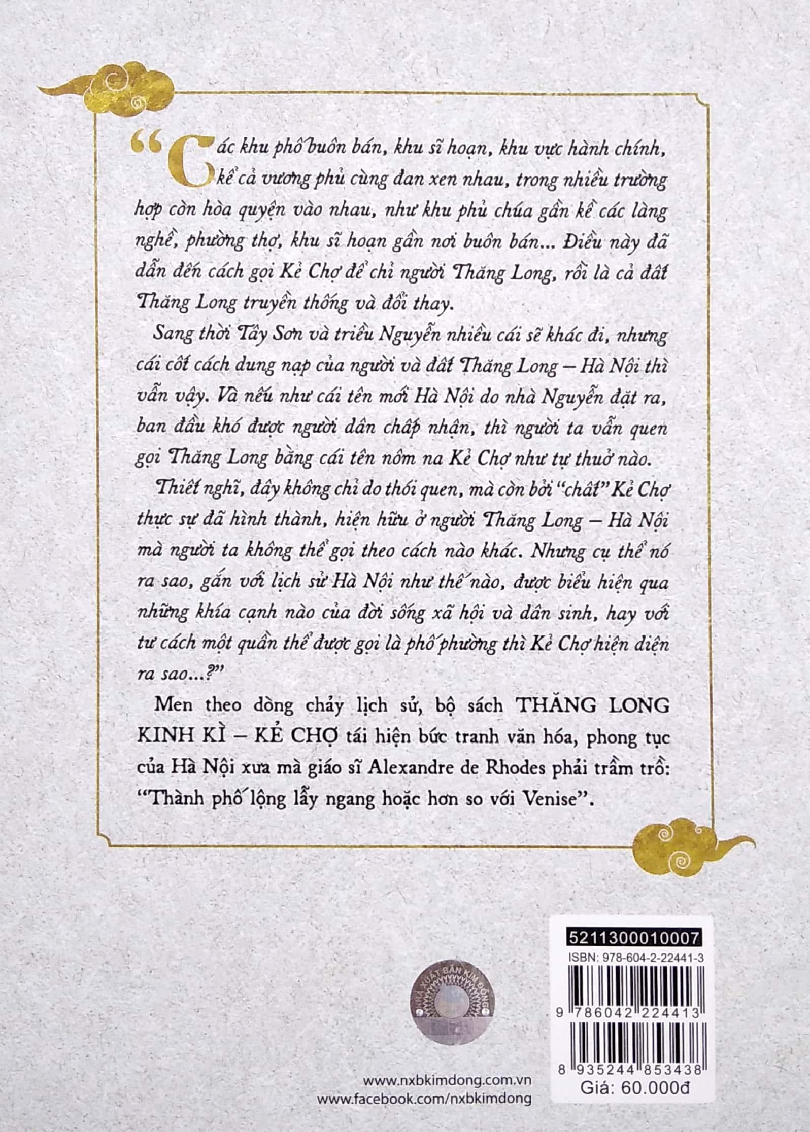 Men theo dòng chảy lịch sử, bộ sách THĂNG LONG KINH KÌ – KẺ CHỢ tái hiện bức tranh văn hóa, phong tục của Hà Nội xưa mà giáo sĩ Alexandre de Rhodes phải trầm trồ: “Thành phố lộng lẫy ngang hoặc hơn so với Venise”.