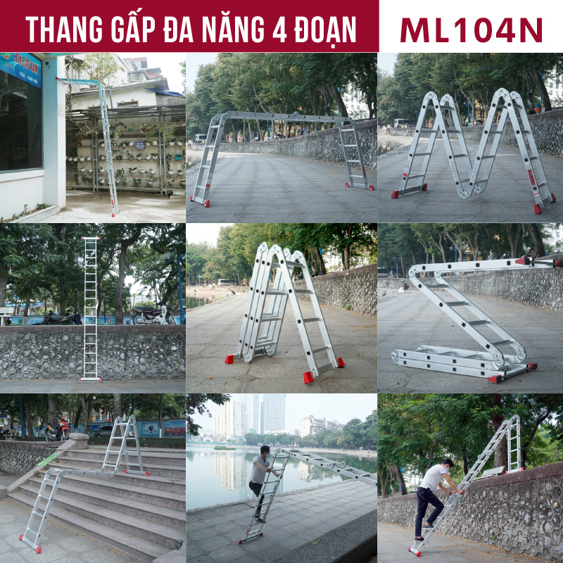 THANG NHÔM GẤP ĐA NĂNG 4 ĐOẠN FUJIHOME ML104N [CHIỀU CAO CHỮ A 2.2M- CAO CHỮ I 4,4 MÉT ] CÔNG DỤNG: Thang nhôm gấp đa năng 4 đoạn FUJIHOME ML104N được sử dụng nhiều trong các doanh nghiệp công trường xây dựng. Sử dụng chữ A khi làm việc ở những vị trí cần sự độc lập cao, hoặc duỗi thẳng chữ I khi có điểm tựa, chữ M khi có yêu cầu của công việc, ngoài ra khi không sử dụng có thể gấp gọn lại tiện lợi khi di chuyển và cất giữ. ƯU ĐIỂM VƯỢT TRỘI: