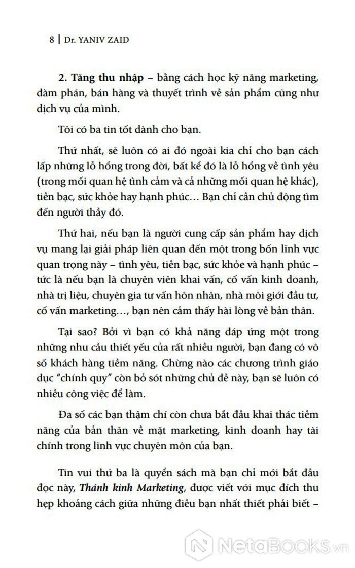 Cuốn sách Thánh Kinh Marketing thu hẹp khoảng cách giữa những điều bạn nhất thiết phải biết về bán hàng, tiếp thị, thuyết phục, đàm phán, thuyết trình và công việc kinh doanh nói chung với những điều bạn được dạy trong môi trường “chính quy”, nhằm giúp bạn phát huy tối đa mọi tiềm năng và đưa bạn tới đỉnh cao của thành công. Tiến sĩ Yaniv Zaid mang đến cho độc giả của ông mười quy tắc vàng trong marketing, thương thuyết và bán hàng, những điều họ cần phải biết trong thế kỷ 21.