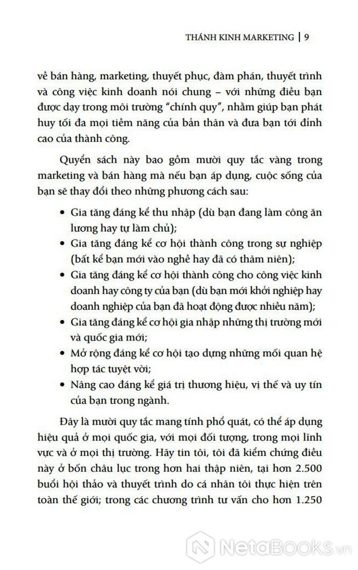 Bất kể bạn là một quản lý cấp cao, một CEO, một người khởi nghiệp, một doanh nhân hay người làm công ăn lương, bạn đều tìm thấy được những giá trị trong quyển sách này – có thể là về marketing, bán hàng, hoặc nghệ thuật thương thuyết, hay đơn giản là cảm hứng từ một trải nghiệm thực tế và câu chuyện của những người trong nghề. Qua đó, bạn có thể tự xây dựng cho mình một chiếc la bàn định hướng trong lĩnh vực marketing hiện đại và mở khóa tiềm năng, tiếp cận nhiều cơ hội để phát triển và đột phá.