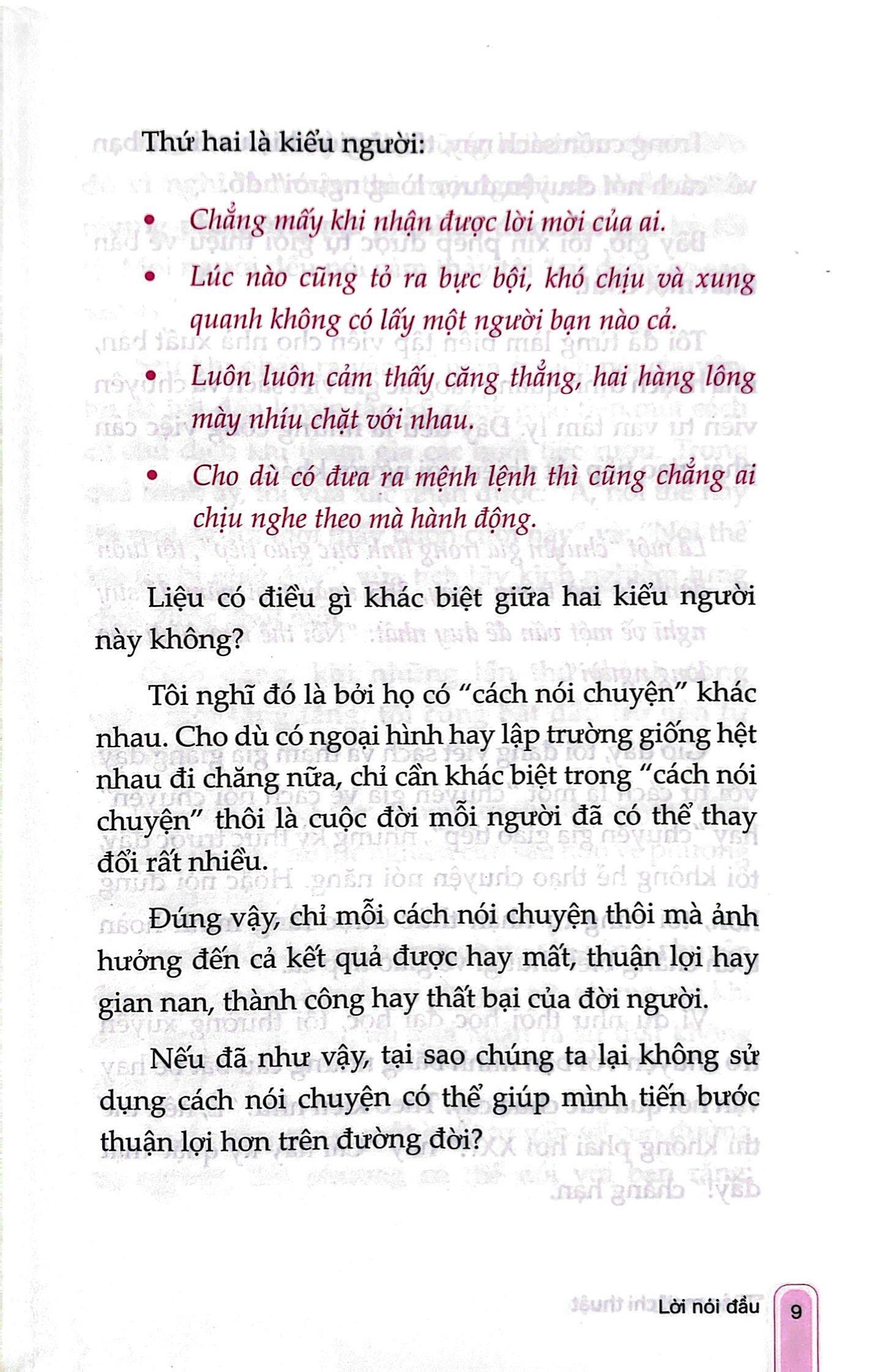 Người ta thường có xu hướng cho rằng để có thể xây dựng mối quan hệ tốt đẹp với người khác, điều thiết yếu là sự phù hợp trong tính cách, lập trường, tuổi tác hay giới tính của cả đôi bên. Tuy nhiên, sự thật không phải như vậy. “Cách nói chuyện” mới là thứ làm cho mối quan hệ giữa người với người trở nên tốt đẹp hơn hoặc tồi tệ đi.