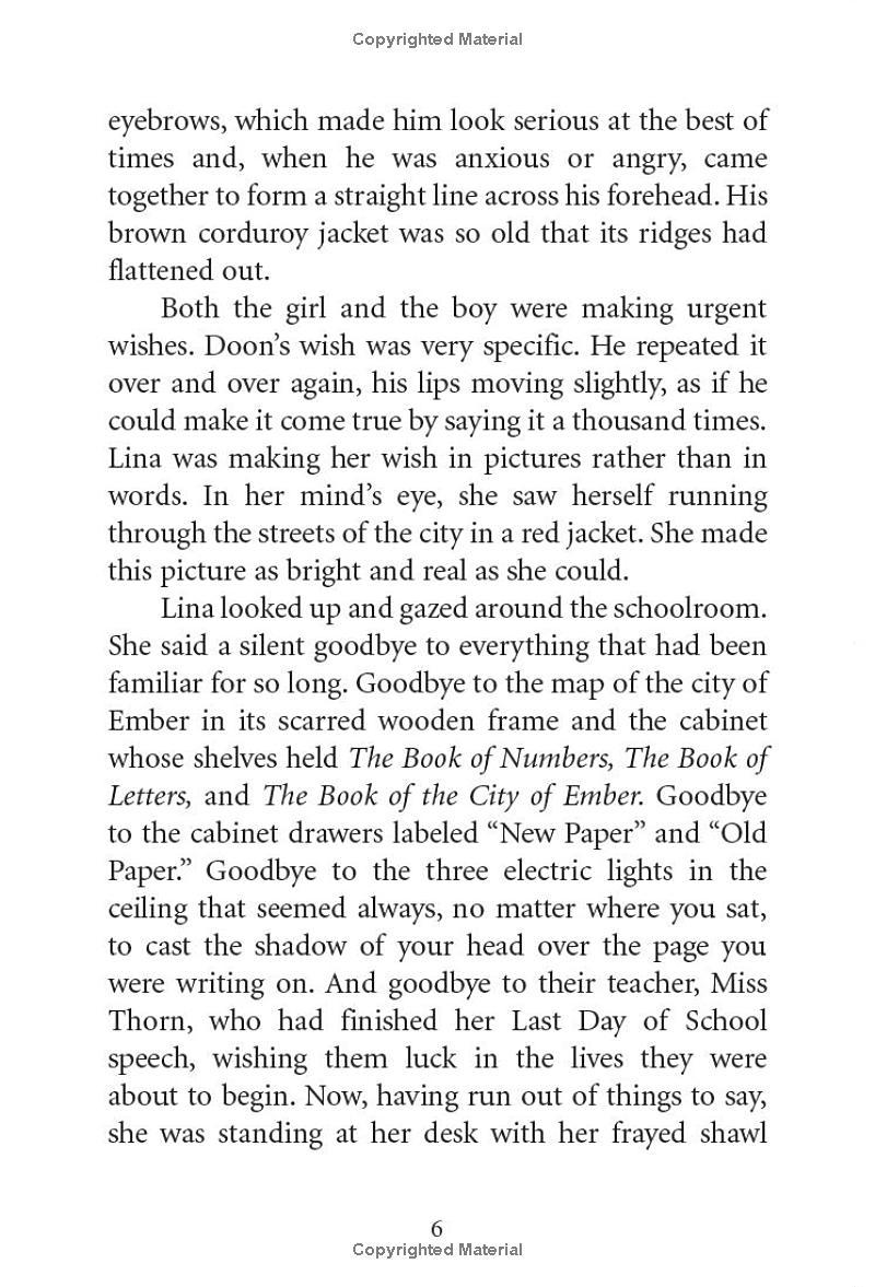 A modern-day classic. This highly acclaimed adventure series about two friends desperate to save their doomed city has captivated kids and teachers alike for almost fifteen years and has sold over 3.5 MILLION copies! The city of Ember was built as a last refuge for the human race. Two hundred years later, the great lamps that light the city are beginning to flicker. When Lina finds part of an ancient message, she's sure it holds a secret that will save the city. She and her friend Doon must race to figure out the clues before the lights go out on Ember forever! Nominated to 28 State Award Lists! An American Library Association Notable Children's Book A New York Public Library 100 Titles for Reading and Sharing Selection A Kirkus Reviews Editors' Choice A Child Magazine Best Children's Book A Mark Twain Award Winner A William Allen White Children's Book Award Winner "A realistic post-apocalyptic world. DuPrau's book leaves Doon and Lina on the verge of undiscovered country and readers wanting more." --USA Today "An electric debut." --Publishers Weekly, Starred "While Ember is colorless and dark, the book itself is rich with description." --VOYA, Starred "A harrowing journey into the unknown, and cryptic messages for readers to decipher." --Kirkus Reviews, Starred