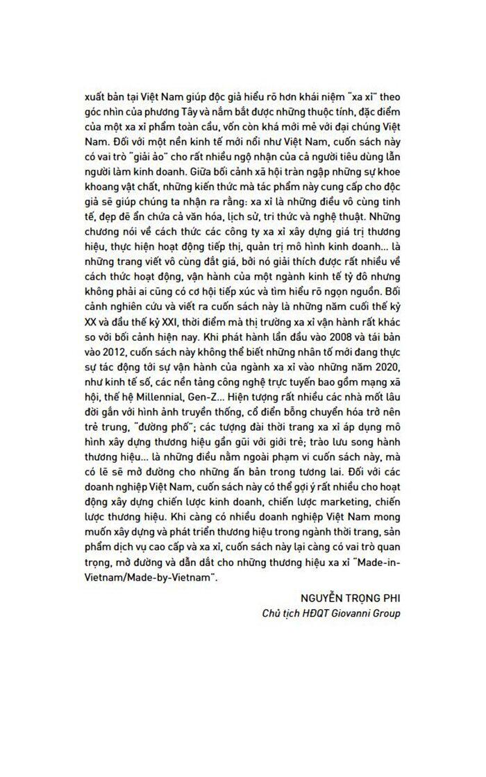 Dựa trên phân tích về các chức năng xã hội của hàng xa xỉ, các phương pháp hay nhất trên toàn thế giới (ngoài các lĩnh vực hàng xa xỉ truyền thống) và kinh nghiệm trực tiếp, nó đặt ra các quy tắc hạn chế và thường là nghịch lý để thành công, chẳng hạn như đảo ngược các quy tắc tiếp thị vốn có. Cuốn sách sẽ: