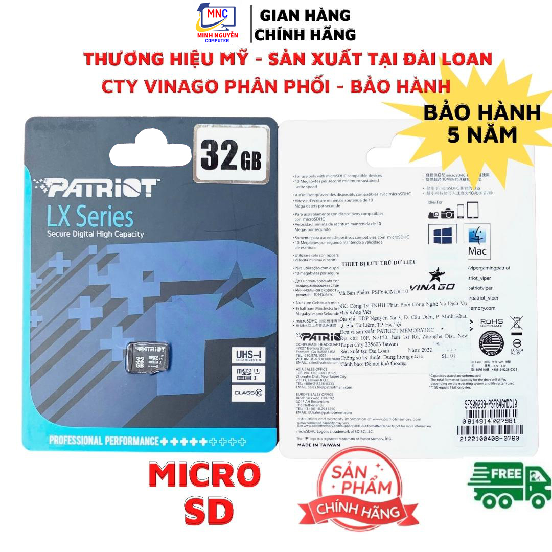 Mua tại TiktokThẻ Nhớ PATRIOT 32GB, 64GB, 128GB Micro SD - Bảo Hành 5 Năm Chính Hãng Giới thiệu Thẻ Nhớ PATRIOT 32GB, 64GB, 128GB Micro SD Sản xuất: Đài Loan Phân phối: VINAGO Co., LTD