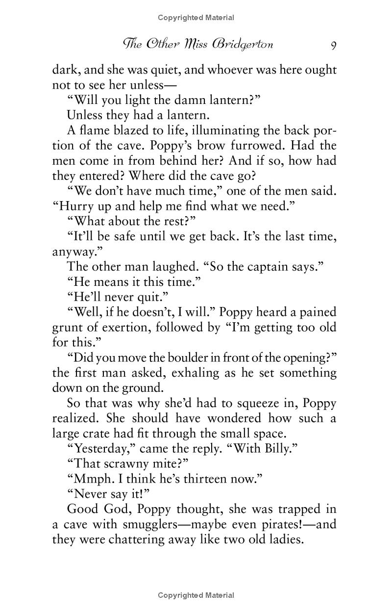 Fiercely independent and adventurous, Poppy Bridgerton will only wed a suitor whose keen intellect and interests match her own. Sadly, none of the fools from her London season qualify. While visiting a friend on the Dorset coast, Poppy is pleasantly surprised to discover a smugglers’ hideaway tucked inside a cave. But her delight turns to dismay when two pirates kidnap her and take her aboard a ship, leaving her bound and gagged on the captain’s