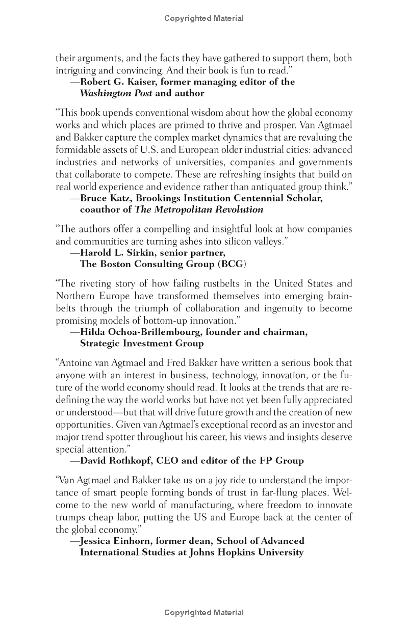 Antoine van Agtmael and Fred Bakker counter recent conventional wisdom that the American and northern European economies have lost their initiative in innovation and their competitive edge by focusing on an unexpected and hopeful trend: the emerging sources of economic strength coming from areas once known as "rustbelts" that had been written off as yesterday's story.