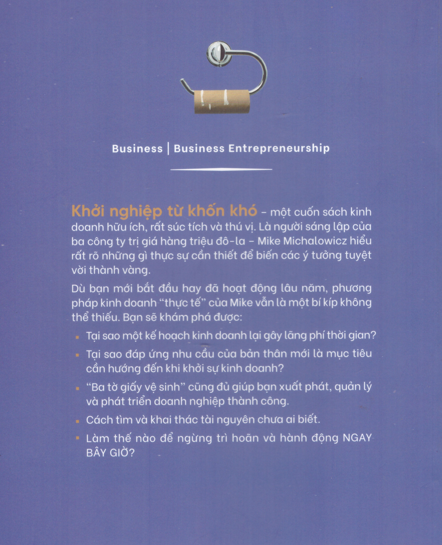 Bạn có muốn khởi nghiệp nhưng không có vốn, không có quan hệ, không có lợi thế? Bạn loay hoay giữa vô vàn khó khăn mà chẳng biết bắt đầu từ đâu? Đừng lo! Cuốn sách Khởi nghiệp từ khốn khổ (The Toilet Paper Entrepreneur) của Mike Michalowicz chính là “kim chỉ nam” giúp bạn biến nghịch cảnh thành bệ phóng thành công!