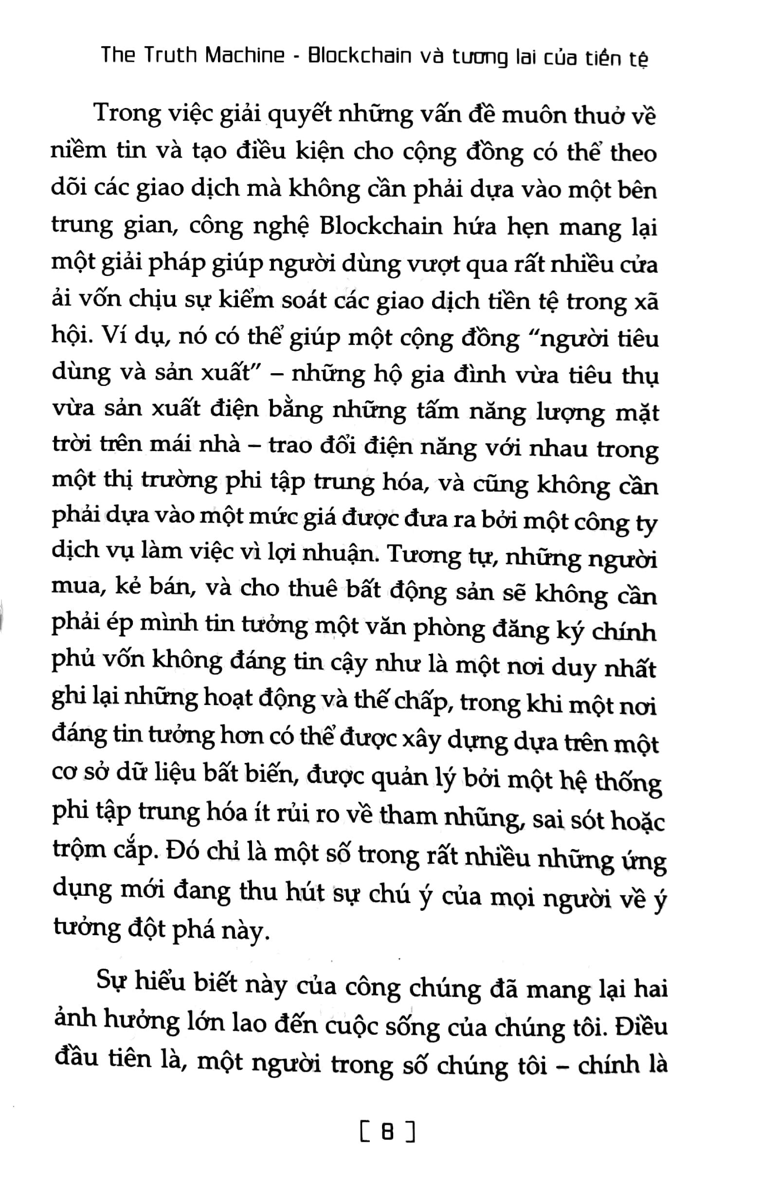 Trong "The truth machine: Blockchain và tương lai của tiền tệ", Paul Vigna và Michael J. Casey đã làm sáng tỏ vấn đề blockchain và giải thích lý do tại sao nó có thể khôi phục quyền kiểm soát cá nhân đối với dữ liệu, tài sản và danh tính của chúng ta. Cuốn sách khám phá cách thức mà công nghệ này, cũng như rất nhiều ứng dụng của nó (tiêu biểu như Bitcoin) đang hoạt động nhằm tái cơ cấu lại các tổ chức xã hội, và tạo ra vô số tiềm năng vĩ đại. Nối tiếp tác phẩm "Kỷ nguyên tiền điện tử" đã gây tiếng vang lớn, bộ đôi tác giả tiếp tục cung cấp cho người đọc một cái nhìn tổng quan hơn về xã hội trong "The truth machine: Blockchain và tương lai của tiền tệ". Đọc hết tác phẩm này, và bạn sẽ hiểu được chúng ta đang đứng trước các cơ hội và thách thức như thế nào khi ứng dụng công nghệ blockchain vào cuộc sống.