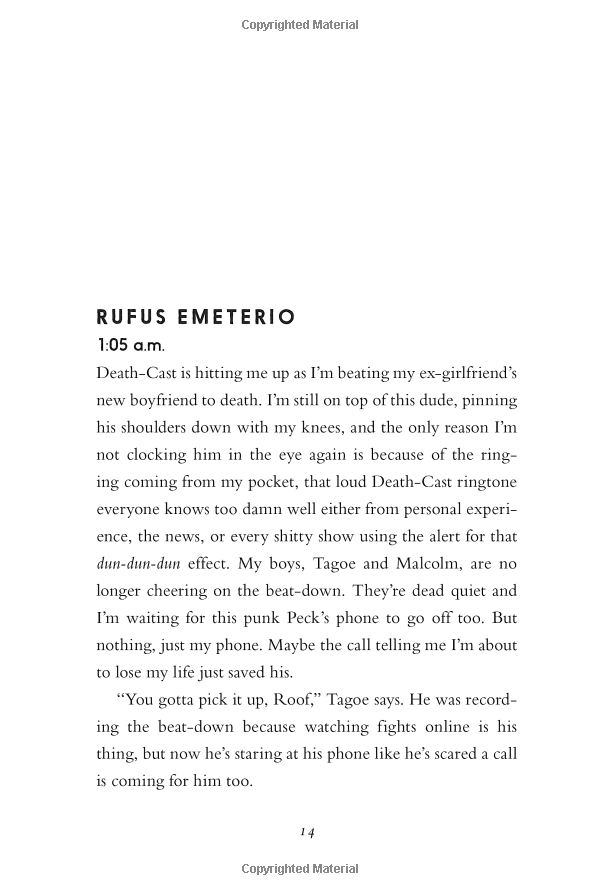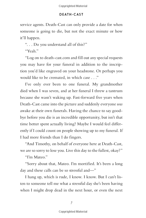 On September 5, a little after midnight, Death-Cast calls Mateo Torrez and Rufus Emeterio to give them some bad news: They're going to die today.