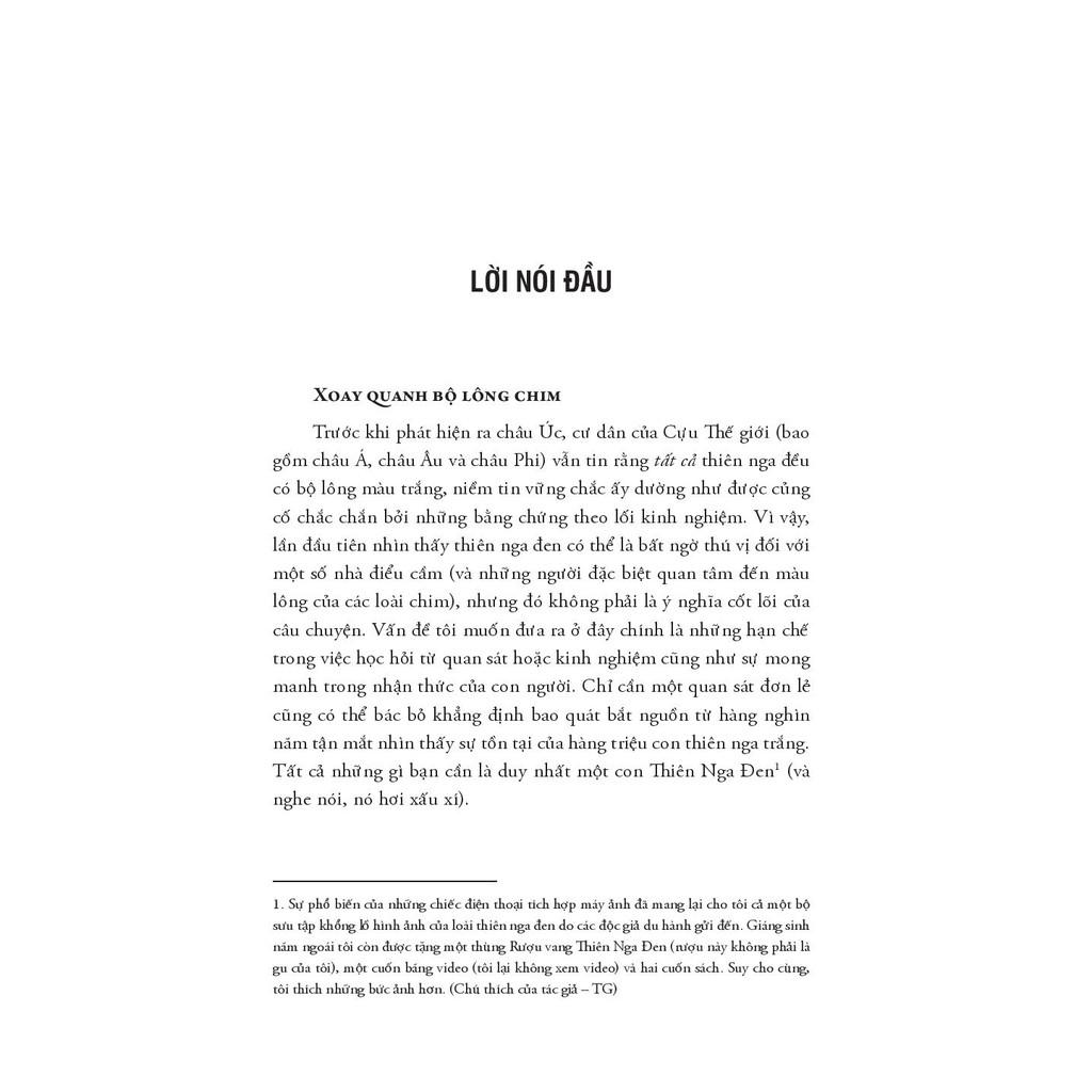 Chúng ta không biết rất nhiều thứ nhưng lại hành động như thể mình có khả năng dự đoán được mọi điều. Và trong cuốn sách này, tác giả Nassim Nicholas Taleb đã đi sâu vào khai thác những sai lầm của tư tưởng cố hữu ấy. Theo ông, “thiên nga đen” là một biến cố tưởng chừng như không thể xảy ra với ba đặc điểm chính: không thể dự đoán, có tác động nặng nề và sau khi nó xảy ra, người ta lại dựng lên một lời giải thích để khiến nó trở nên ít ngẫu nhiên hơn, dễ dự đoán hơn so với bản chất thật của nó. Thành công đáng kinh ngạc của Fb có thể được coi là một “thiên nga đen”, việc nước Anh rời khỏi Liên minh châu u cũng là một “thiên nga đen”. Thiên nga đen luôn ẩn hiện trong mọi mặt của cuộc sống với những tác động khó lường, theo cả hướng tiêu cực và tích cực.