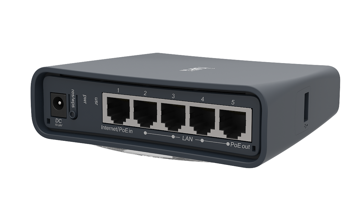 Unit is equipped with a 650MHz CPU, 64MB RAM, five 10/100Mbps Ethernet ports (PoE output on port #5), dual-chain 802.11b/g/n 2.4GHz wireless, single chain 802.11a/n/ac 5GHz wireless, USB port for 3G/4G modem and a RouterOS L4 license.