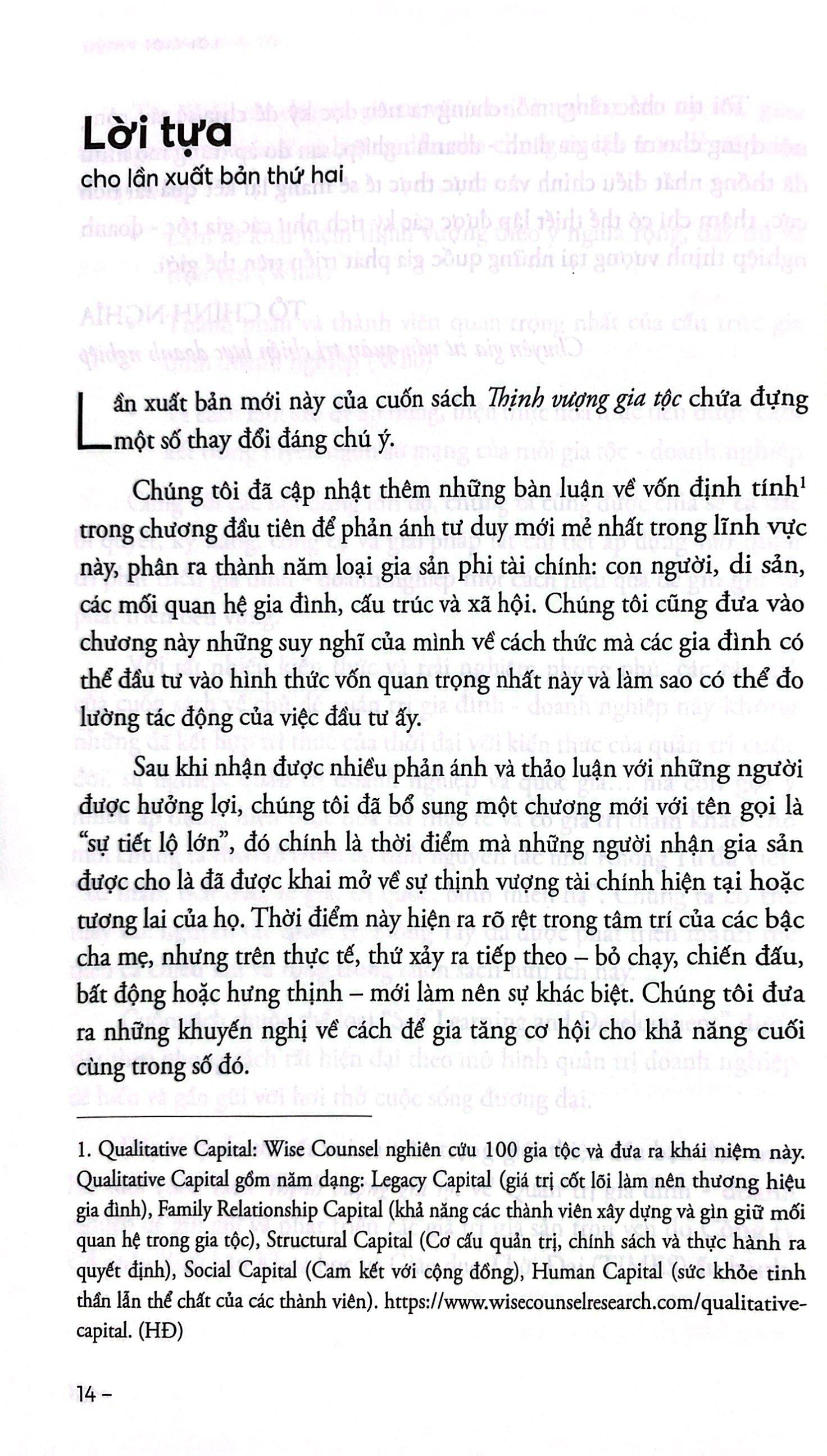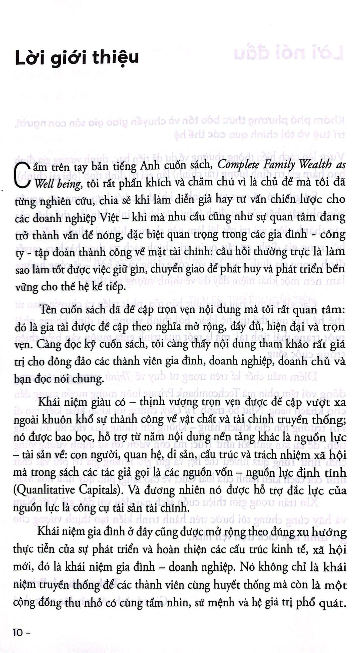 Thịnh Vượng Gia Tộc (Bìa mềm) Thịnh vượng gia tộc giúp chúng ta phát triển, duy trì và quản lý tài sản qua các thế hệ. Cuốn sách là tập hợp những hướng dẫn được cập nhật và mở rộng để thay đổi cách bạn nghĩ về sự giàu có và di sản của m.ình. Cuốn sách còn cung cấp câu trả lời bạn cần cùng với hướng dẫn và chiến lược để giữ nguyên khối tài sản của gia đình bạn. Thịnh vượng gia tộc cung cấp tư duy mới nhất về thịnh vượng, những ý tưởng và thực hành có ý nghĩa lâu dài để các gia đình duy trì, phát triển và quản lí tài sản qua các thế hệ. Cuốn sách là tập hợp những hướng dẫn được cập nhật và mở rộng để thay đổi cách chúng ta nghĩ về thịnh vượng và di sản của m.ình. Thịnh vượng đích thực vượt lên trên tiền bạc đơn thuần, bao gồm 6 loại gia sản: