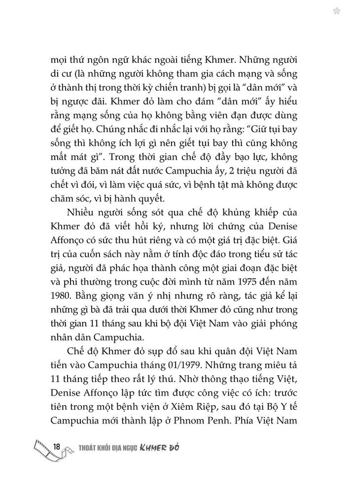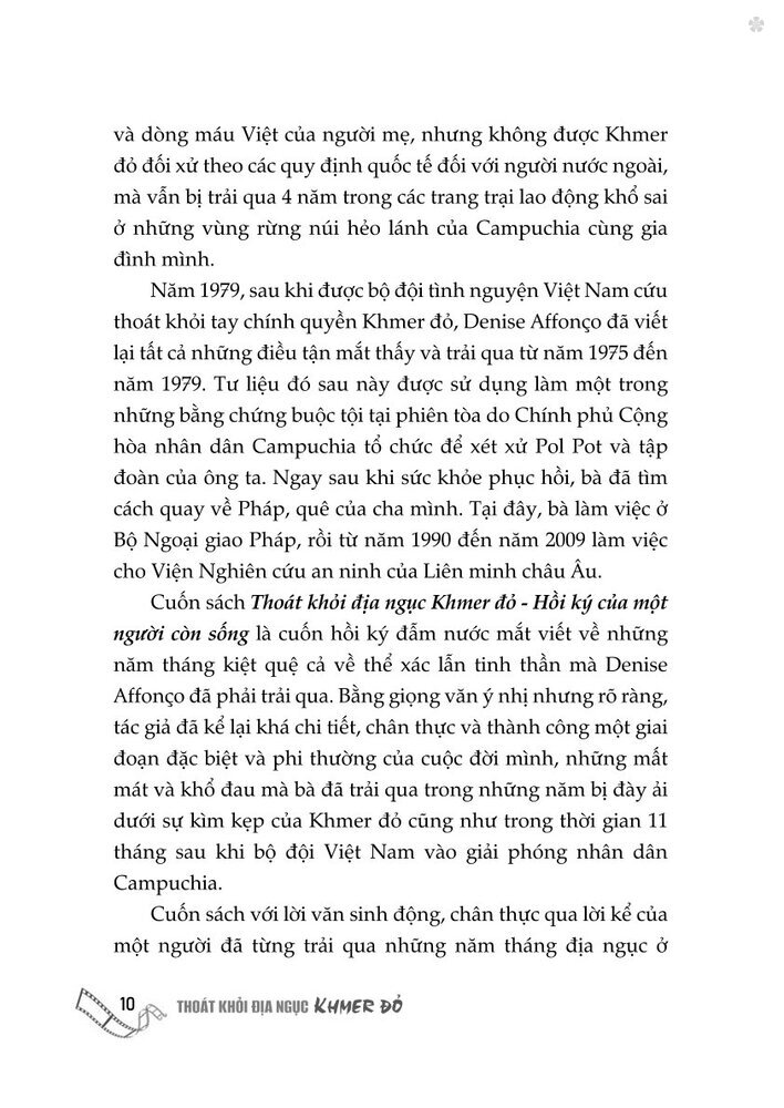 Cuốn sách Thoát khỏi địa ngục Khơmer đỏ - Hồi ký của một người còn sống là cuốn hồi ký đẫm nước mắt viết về những tháng năm kiệt quệ cả về thể xác lẫn tinh thần mà Denise Affonco đã phải trải qua.