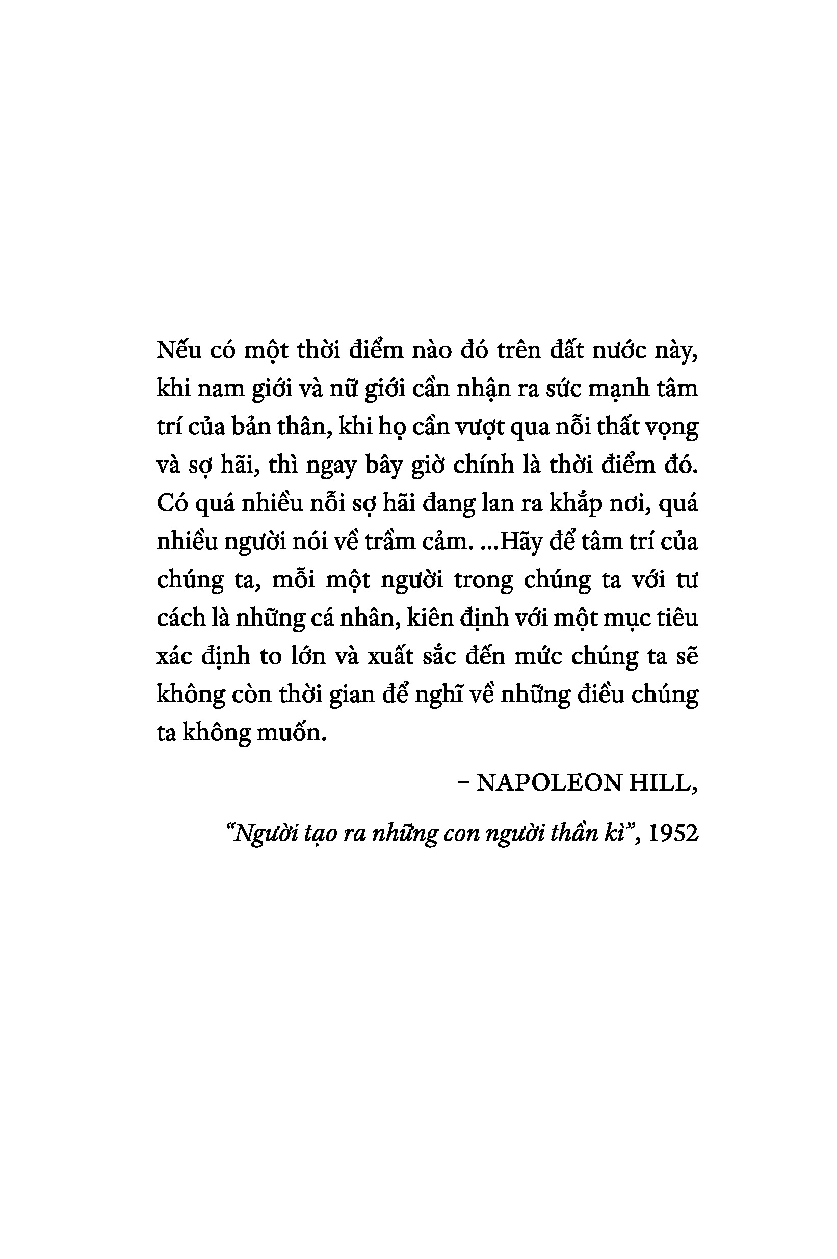 Câu nói nổi tiếng trong bài diễn văn nhậm chức của Tổng thống Franklin D. Roosevelt đã khắc sâu vào tâm thức công chúng, nhưng rất ít người biết rằng cảm hứng cho câu nói đó lại bắt nguồn từ một trong những người thầy của ông, Napoleon Hill. Được ông trùm ngành thép vĩ đại Andrew Carnegie tin tưởng giao phó việc xây dựng triết lý về thành tích cá nhân, Napoleon Hill đã dành 25 năm để tiến hành nghiên cứu hơn 500 cá nhân xuất sắc để khám phá ra một quy luật kỳ diệu của tâm trí con người, đảm bảo thành công cá nhân và nghề nghiệp. Những nguyên tắc thành tựu mà ông phát hiện đã giúp cả một thế hệ phá vỡ những ràng buộc của nỗi sợ hãi gây ra cuộc Đại suy thoái và chiến tranh thế giới, đồng thời nâng bản thân lên những cấp độ thành công mới – và chúng vẫn còn hiệu quả cho đến ngày nay.