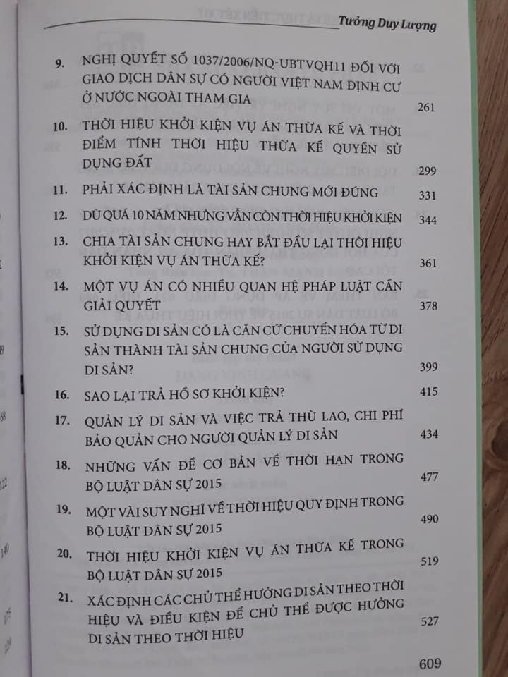 Trong xu thế hội nhập và phát triển, để các quan hệ dân sự phát huy được tác dụng tích cực, góp phần thúc đẩy xã hội phát triển lành mạnh thì phải tạo sự ổn định cho các quan hệ dân sự, từ đó tạo tâm lý yên tâm cho các chủ thể trong giao lưu dân sự. Do đó, pháp luật quy định các thời hạn để các bên có thể lựa chọn cách xử sự cho phù hợp vì lợi ích của mình. Khi kết thúc thòi hạn đó trong những điều kiện theo luật định có thể làm phát sinh hay chấm dứt quyền, nghĩa vụ của những chủ thể có liên quan. Thời hạn đó được gọi là thời hiệu.Qua thực tiễn xét xử cho thấy, việc hiểu và áp dụng các quy định của pháp luật về thời hiệu trong các vụ việc dân sự nói chung, tranh chấp về thừa kế nói riêng đang còn có những quan điểm, ý kiến khác nhau. Cũng vì nguyên nhân này mà có một số vụ việc đường lối giải quyết của các cấp Tòa án không thông nhất, phải xét xử nhiều lần, gây nhiều tốn kém cả về thời gian, công sức, tiền bạc cho cơ quan tiến hành tố tụng cũng như người dân, nhất là đối với những vụ việc thừa kê mà thời điểm mở thừa kế đã diễn ra nhiều năm trước, khi pháp luật có sự thay đổi, các quan hệ đã có nhiều biến động, việc thu thập tài liệu, chứng cứ gặp nhiều khó khán...Pháp lệnh Thừa kế 1990 lần đầu tiên đã quy định về thời hiệu thừa kế, là cơ sở cho việc tính thời hiệu thừa kế của các vụ việc đã mở trước, trong và sau khi Pháp lệnh này có hiệu lực. Bộ luật Dân sự 1995, Bộ luật Dân sự 2005 và các văn bản hướng dẫn thi hành trên cơ sở kế thừa và quy định cụ thể hơn đã tạo cơ sở pháp lý vững chắc cho việc xác định thời hiệu khởi kiện về thừa kế và các quan hệ pháp luật liên quan. Khi Bộ luật Dân sự 2015 được ban hành đã đánh dấu một bước tiến quan trọng trong kỹ thuật lập pháp, tư duy pháp lý trong việc điều chỉnh các quan hệ dân sự nói chung, quan hệ pháp luật thừa kế nói riêng, đặc biệt là các quy định về thời hiệu thừa kế, thời hiệu hưởng quyền dân sự, miễn trừ nghĩa vụ dân sự.Với mục đích góp phần nâng cao nhận thức trong thực thi và áp dụng pháp luật ngày một tốt hơn, tạo sự thống nhất trong thực tiễn xét xử, từ đó làm cho các quy định rất hợp lý, khoa học về thừa kế, về thời hiệu của Bộ luật Dân sự có sức sống mạnh mẽ hơn nữa, Nhà xuất bản Tư pháp tái bản có sửa đổi, bổ sung cuốh Thời hiệu, thừa kế và thực tiễn xét xử của Luật sư, Trọng tài viên Trung tâm Trọng tài quốc tế Việt Nam (VIAC) Tưởng Duy Lượng - nguyên Phó Chánh án Tòa án nhân dân tối cao, người có bề dày trong công tác nghiên cứu khoa học pháp lý, với vốn kiến thức chuyên sâu về lý luận trong lĩnh vực pháp luật dân sự nói chung, pháp luật về thời hiệu, thừa kế nói riêng và kinh nghiệm nhiều năm trực tiếp xét xử các vụ việc dân sự, kinh tế.Qua nghiên cứu về lý luận, về thực tiễn, trên cơ sở những vụ việc cụ thể hoặc những tình huống giả định có thể xảy ra trong thực tiễn để minh họa, làm rõ từng chủ đề được nêu trong cuốn sách, từ đó đưa ra những nhận xét, bình luận và các đề xuất về nội dung cần hướng dẫn, sửa đổi, bổ sung luật hoàn toàn mang tính khoa học và thể hiện quan điểm của riêng tác giả.