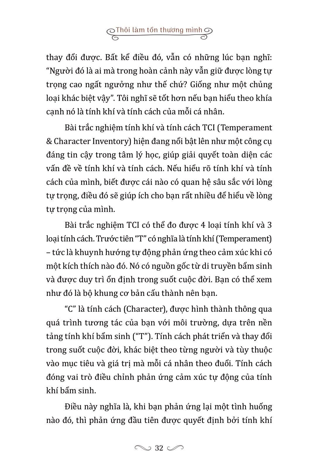 Mong rằng những bạn trẻ đang mang trong m.ình những vết thương do lòng tự trọng giả tạo gây ra, sau khi đọc quyển sách “Thôi Làm Tổn Thương Mình” này, sẽ có thể tự m.ình đứng dậy, có được lòng tự trọng thật sự và có thể đồng cảm với người khác.