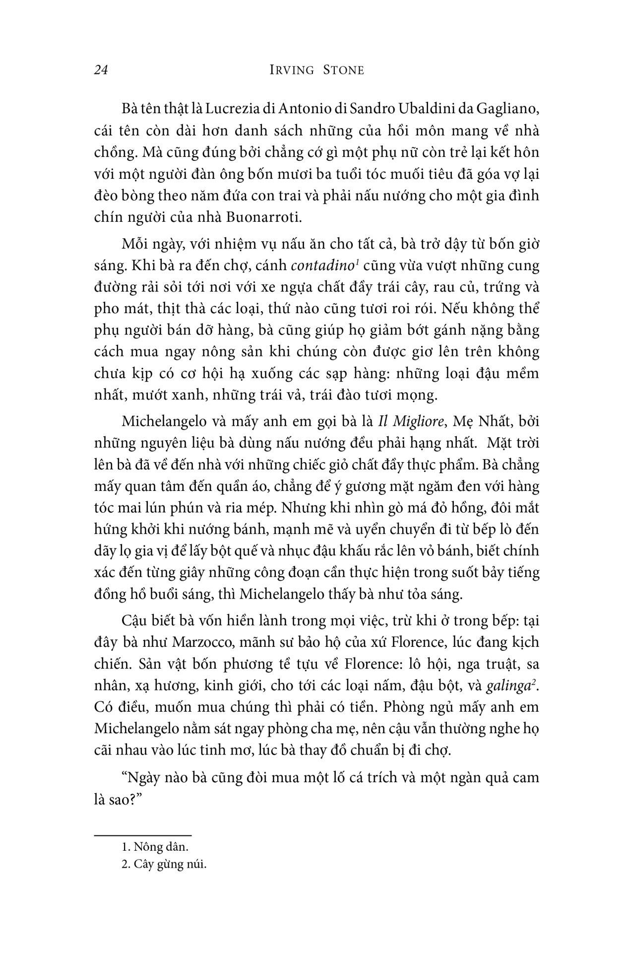 “Tiểu thuyết hóa cuộc đời của Michelangelo Buonarroti, nghệ sĩ nổi tiếng mọi thời đại với nhiều công trình sáng tạo bất tử, tác phẩm đã đưa chúng ta xuyên qua thời Phục hưng, đến với hành trình kì vĩ và ngặt nghèo của người nghệ sĩ nỗ lực tìm đường sống cho m.ình bất chấp mọi khó khăn, thách thức.” - Bookwormex