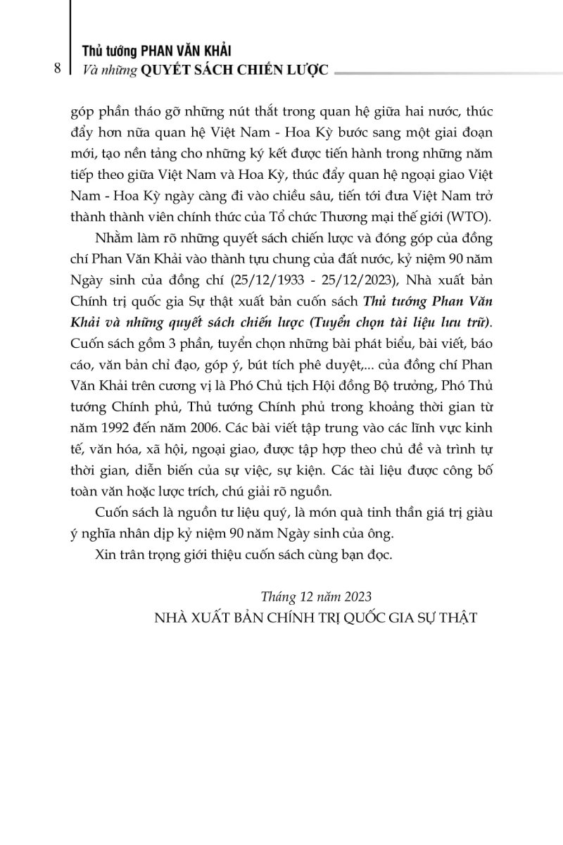 Nhân kỷ niệm 90 năm Ngày sinh Thủ tướng Phan Văn Khải, Trung tâm Lưu trữ quốc gia III, chúng tôi biên soạn cuốn sách Thủ tướng Phan Văn Khải và những quyết sách chiến lược (Tuyển chọn tài liệu lưu trữ) nhằm thể hiện những hoạt động nổi bật nhất của Thủ tướng Phan Văn Khải trong các lĩnh vực kinh tế, văn hóa – xã hội, giáo dục, ngoại giao qua các tài liệu, tư liệu được chọn lọc từ lưu trữ quốc gia.