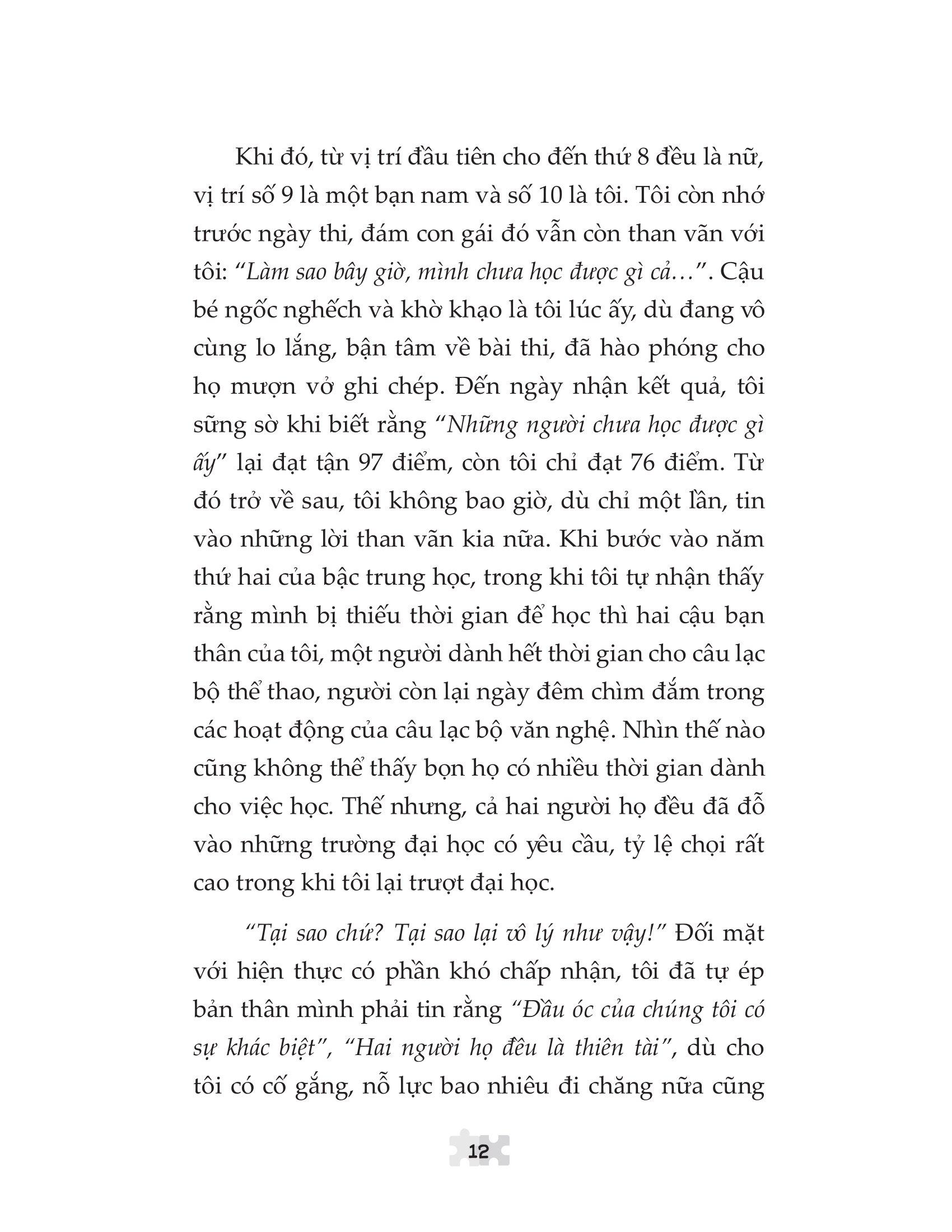 - Làm thế nào để học tập, làm việc đạt được kết quả cao hơn? Nó có thể do bẩm sinh nhưng cũng có thể do sự khác biệt về phương pháp học tập hay làm việc. Một khi tìm được nguyên nhân, bạn sẽ nhận ra phương hướng cho sự nỗ lực của m.ình. Vì vậy, khi kết quả đạt được không như ý, đó không phải là do bạn nỗ lực chưa đủ, mà là do phương hướng bạn lựa chọn đã sai lầm ngay từ đầu. Điều quan trọng chính là tìm ra cách cải thiện não bộ của chính bạn, phương pháp đó được gọi là thuật “hack não”. Một khi “thông số kỹ thuật” của hệ điều hành não bộ được cải thiện, hành động so sánh này sẽ dần được giảm thiểu, đồng thời, mong muốn tự khẳng định bản thân cũng nâng cao. Khi mong muốn tự khẳng định bản thân được nâng cao, bạn sẽ hoà nhã, thân thiện hơn với những người xung quanh bởi khi đó bạn hài lòng với chính m.ình. Con người có xu hướng tìm kiếm những điểm tương đồng với tâm hồn, vì thế khi bạn hài lòng với chính m.ình, bạn sẽ nhìn thấy những điểm tốt, những điều tuyệt vời ở đối phương. Ngược lại, khi bạn bất mãn với chính bản thân m.ình, bạn sẽ chỉ nhìn thấy những khiếm khuyết, những thiếu sót của họ. Do đó, nâng cao mong muốn tự khẳng định bản thân cũng là một yếu tố quan trọng giúp bạn cảm thấy hài lòng, thoả mãn hơn với chính m.ình. Vậy, hãy tìm kiếm phương pháp giúp đánh thức tiềm năng não bộ, tăng cường khả năng tư duy, tìm ra sức hấp dẫn của riêng bạn, tìm kiếm những phần tốt đẹp hơn so với bạn trong quá khứ và phát triển chúng. Tác giả: Katsunori Ishida là Giám đốc đại diện Phòng Nghiên cứu thiết kế chương trình giáo dục tại Nhật Bản. Ông đã tổ chức rất nhiều chương trình như Mama Café, các buổi diễn thuyết, viết sách… với mong muốn “giảm thiểu tình trạng trẻ em chán ghét việc học”.