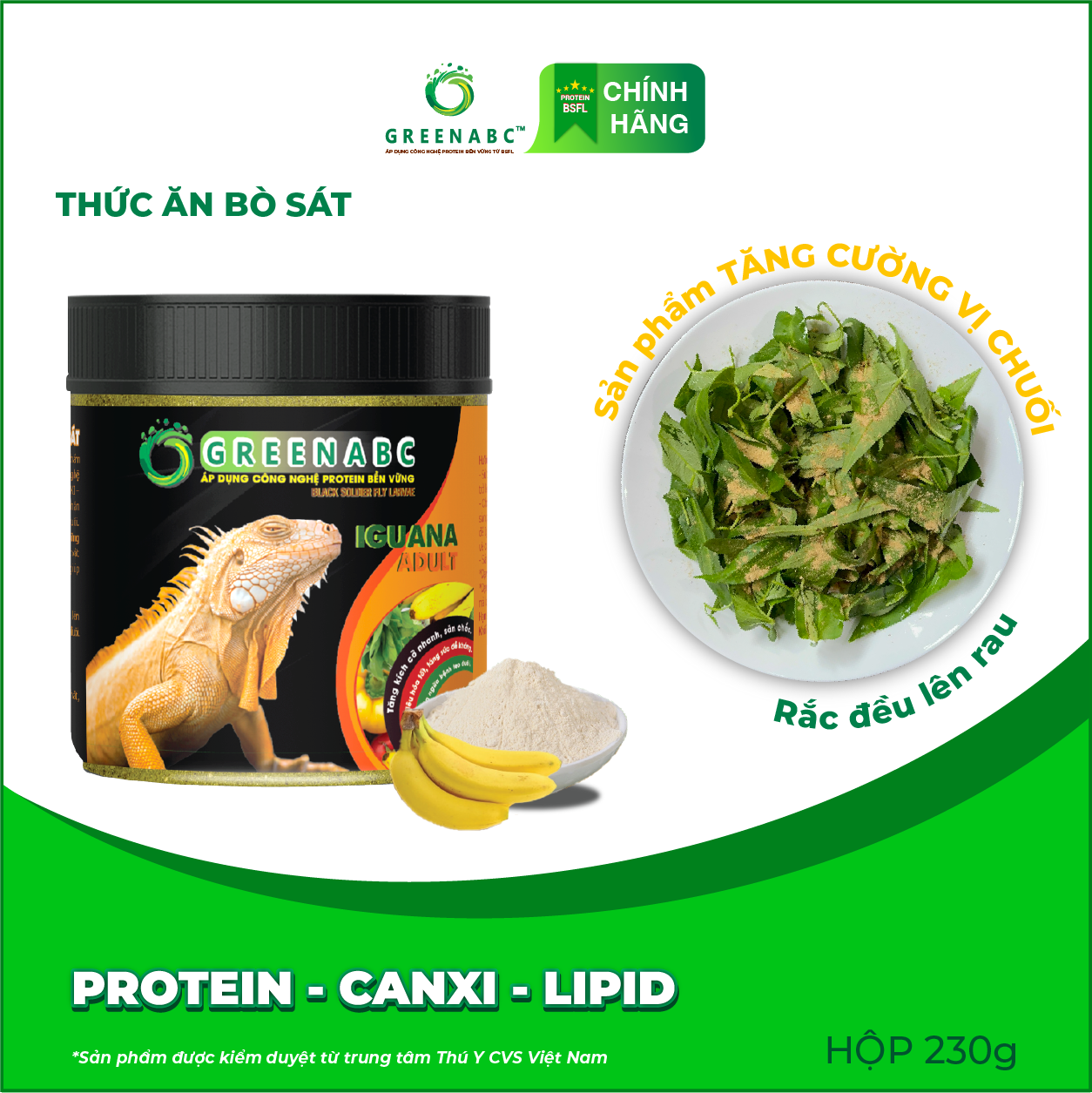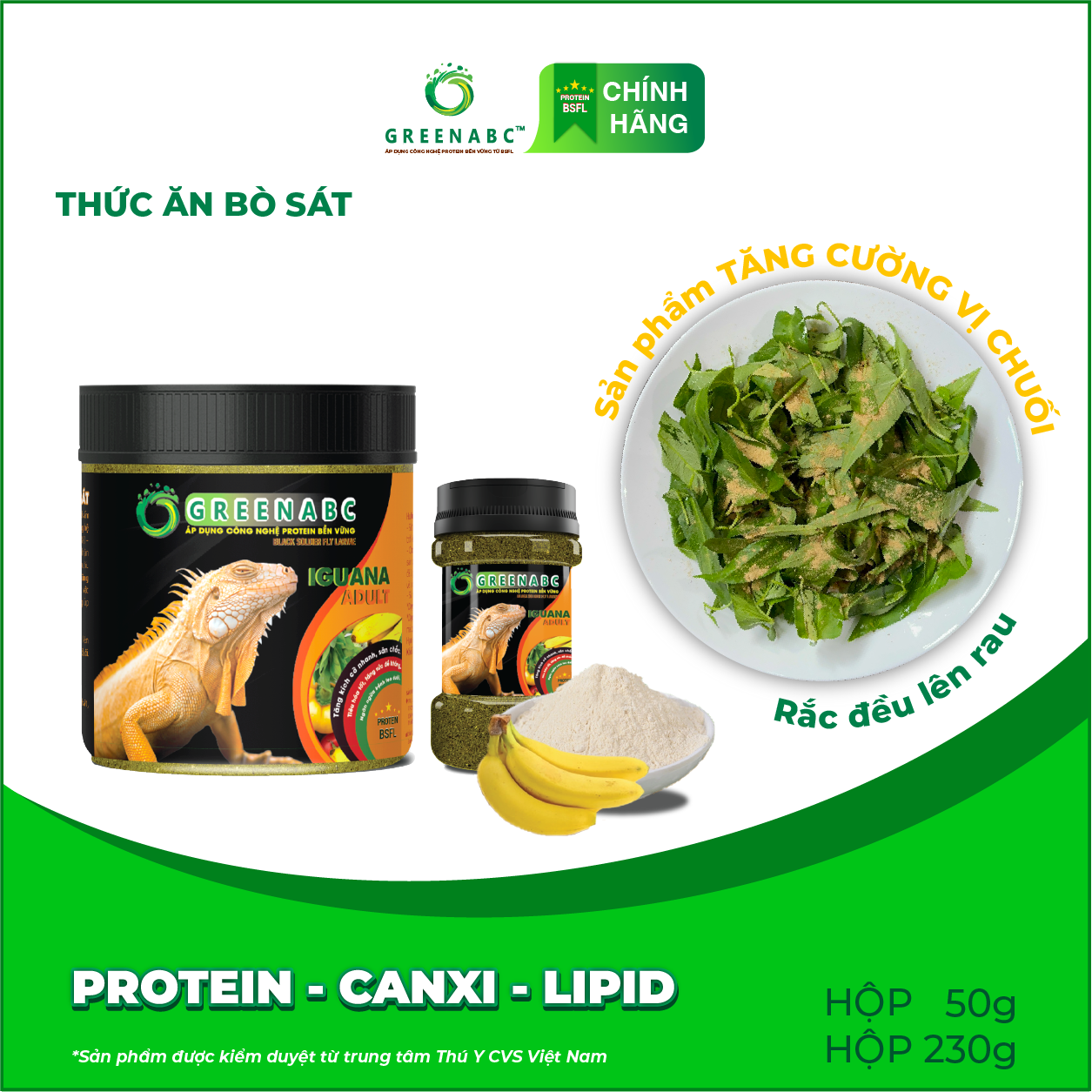 THỨC ĂN BÒ SÁT - BỔ SUNG DINH DƯỠNG PROTEIN, CANXI, LIPID GREENABC là thức ăn cao cấp dành cho các loại bò sát: IGUANA, BEARDED DRAGON, LEOPARD GECKO. Đặc biệt sản phẩm GREENABC được
