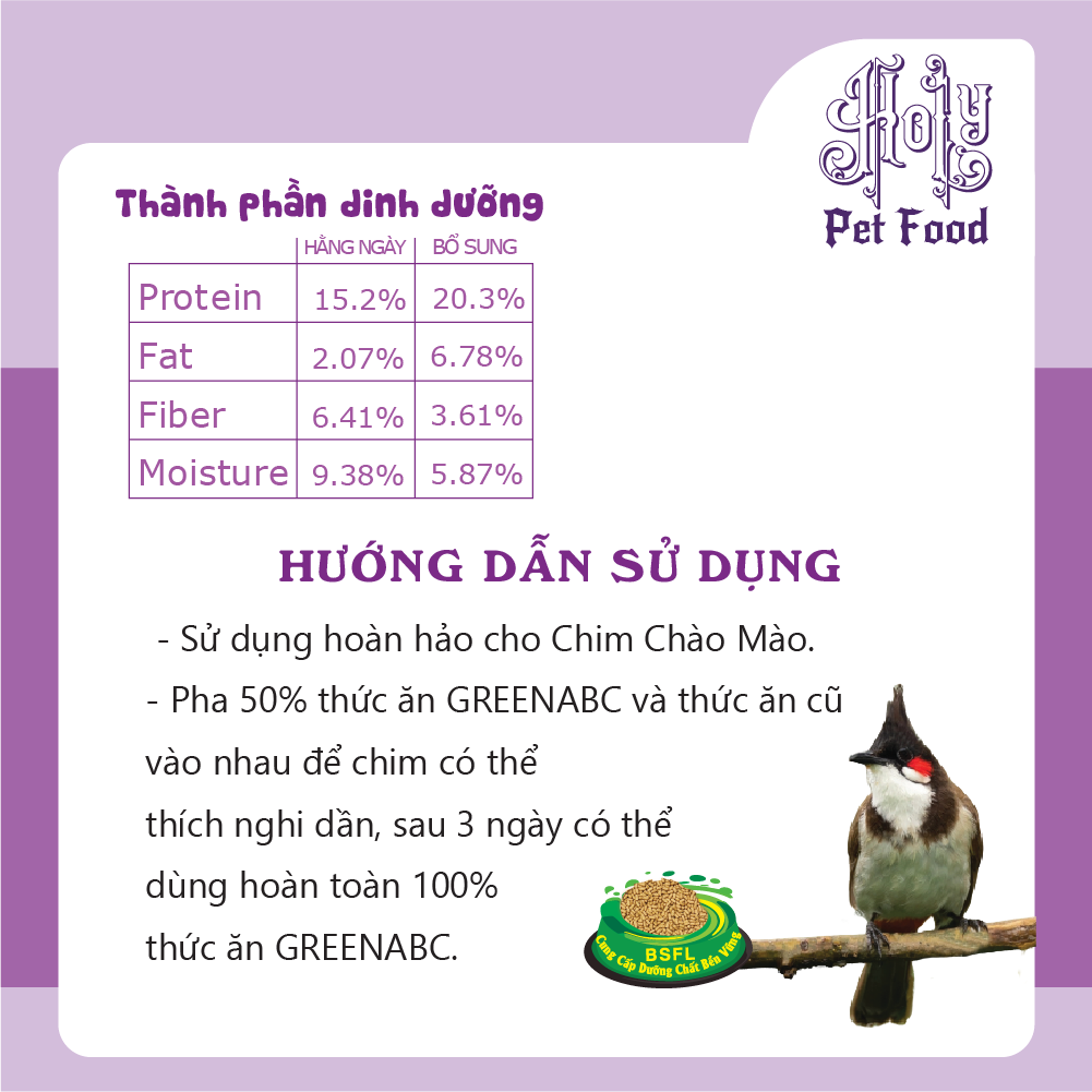 GREENABC - THỨC ĂN CHIM CHÀO MÀO GREENABC là thức ăn cao cấp dành cho CHIM CHÀO MÀO. Đặc biệt sản phẩm GREENABC được sản xuất theo phương pháp Áp dụng công nghệ PROTEIN bền vững từ bột đạm G.Meal rất giàu PROTEIN – CANXI – LIPID có trong BSFL, đã được Mỹ (AAFCO) và EU chấp nhận đưa vào công thức cho ngành sản xuất thức ăn dành cho vật nuôi. Sản phẩm GREENABC cung cấp các giá trị dinh dưỡng bền vững cho thú cưng, giúp chim:      + Kích thích vị giác, ăn ngon miệng hơn.      + Tiêu hóa tốt, tăng cường hấp thụ các dưỡng chất.      + Cơ thể khỏe mạnh, cân đối săn chắc, căng lửa đều ổn định.      + Tăng cường miễn dịch, chống lại các bệnh thường gặp.      + Đặc biệt với thành phần G.Meal đầy đủ các dưỡng chất cần thiết giúp cơ thể phát triển toàn diện.