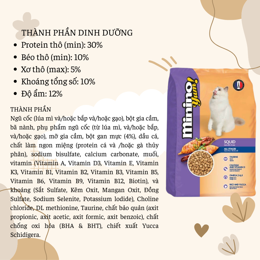 Những năm gần đây, thói quen chăm sóc và nuôi dưỡng mèo ở Việt Nam đã khác xưa rất nhiều. Không còn là con vật nuôi để bắt chuột, các chú chó mèo ngày nay đã được xem như một thành viên trong gia đình. Việc ăn uống của các chú mèo cũng được người nuôi quan tâm sát sao hơn, không còn là “cơm thừa canh cặn” như trước nữa. Chính vì vậy ngành công nghiệp thức ăn chế biến sẵn cho thú cưng ở Việt Nam đã có những bước phát triển vượt bậc. Trong số các thương hiệu thức ăn được bày bán trên thị trường hiện nay, thức ăn cho mèo Minino được nhiều người tin tưởng lựa chọn hơn cả. Những năm gần đây, thói quen chăm sóc và nuôi dưỡng mèo ở Việt Nam đã khác xưa rất nhiều. Không còn là con vật nuôi để bắt chuột, các chú chó mèo ngày nay đã được xem như một thành viên trong gia đình. Việc ăn uống của các chú mèo cũng được người nuôi quan tâm sát sao hơn, không còn là “cơm thừa canh cặn” như trước nữa. Chính vì vậy ngành công nghiệp thức ăn chế biến sẵn cho thú cưng ở Việt Nam đã có những bước phát triển vượt bậc. Trong số các thương hiệu thức ăn được bày bán trên thị trường hiện nay, thức ăn cho mèo Minino được nhiều người tin tưởng lựa chọn hơn cả. Thức ăn cho mèo Minino gồm các thành phần chính sau: Gạo, sản phẩm từ lúa mì, chất béo gia cầm chứa Omega 3 và 6, bột đậu nành, bột cá, dầu cá chứa DHA, taurine, khoáng chất; vitamin A, K3, B2, B6, B1, D3, B12, E, canxi, các khoáng chất đồng, selen, sắt, mangan, kẽm, iốt; canxi; axit Folic; Biotin; Choline; Natri Disulfate; Palatants; Monocalcium Phosphate; Chiết xuất Yucca Schidigera; Chất chống oxy hóa; Cách sử dụng thức ăn cho mèo Minino – Với các chú mèo nặng từ 1-2kg: Nên cho ăn 15-35g/ ngày. – Với các chú mèo từ 2-3kg: Nên cho ăn từ 35-50g/ngày. – Với các chú mèo từ 3-4kg: Nên cho ăn 50-65g/ngày. – Với các chú mèo từ 4-5kg: Nên cho ăn 65-85g/ngày. THÀNH PHẦN DINH DƯỠNG Protein (tối thiểu): 30% Chất xơ thô (tối đa): 5% Chất béo thô (tối thiểu): 10% Độ ẩm (tối đa): 12%