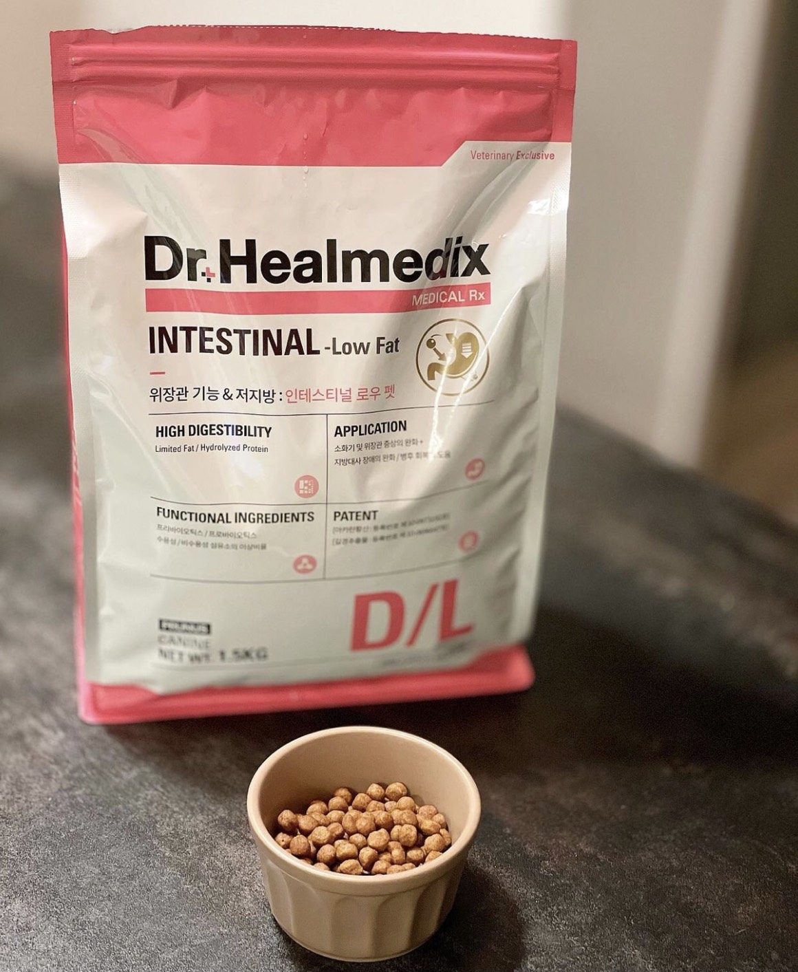 THỨC ĂN HẠT KHÔ CHO CHÓ HỖ TRỢ ĐƯỜNG RUỘT & HỆ TIÊU HÓA DR.HEALMEDIX INTESTINAL LOWFAT ÍT BÉO TÚI 1.5KG CÔNG DỤNG: Cải thiện khả năng tiêu hóa có hiện tượng tiêu chảy cấp tính hoặc mãn tính Chất béo Limited mỡ hạn chế giúp chó cưng không bị bệnh dạ dày và rối loạn chuyển hóa Lipid Với men vi sinh và axit béo omega 3 giúp cho sức khỏe đường ruột. DHA giúp duy trì hệ tiêu hóa. Ngăn chặn quá trình oxy hóa của các tế bào cơ thể bằng oxy hóa. Xuất xứ: Hàn Quốc THÀNH PHẦN: Gạo, yến mạch, protein đậu nành thủy phân, bột gà thủy phân (hương tự nhiên), hạt lanh, dầu đậu nành tinh chế, dầu cá trích, muối, Vitamin E, vitamin C, hỗn hợp dầu khoáng, prebiotics (FOS, Inulin), men vi sinh (B, B.lichenifomis), protease, chất chống oxy hóa tự nhiên (maqueberry, acai bery, aronia, hương thảo, quercetin), omega 3, acaran Axit sunfuric, Chiết xuất cát cánh, Fenugreek, chiết xuất yucca. HƯỚNG DẪN SỬ DỤNG & BẢO QUẢN: Bảo quản nơi thoáng mát tránh ánh sáng mặt trời Chỉ lấy đủ lượng thức ăn cần dùng sau đó đóng gói thức ăn chặt chẽ Để chuyển sang thực phẩm mới hãy thay đổi dần trong khoảng thời gian 1 tuần Lượng ăn hằng ngày có thể tăng hoặc giảm tùy theo nhu cầu của vật nuôi.