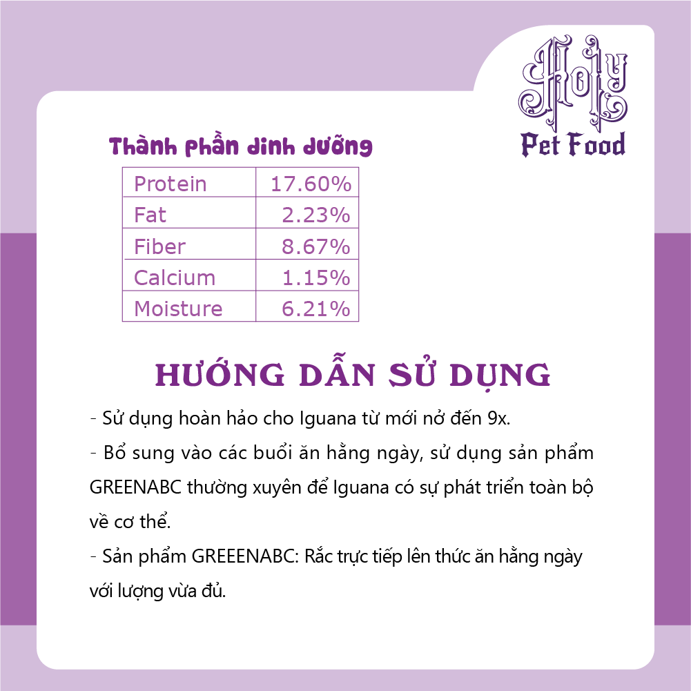 Sản phẩm GREENABC cung cấp các giá trị dinh dưỡng bền vững cho Iguana với sự kết hợp 80% thành phần có nguồn gốc thực vật và 20% thành phần có nguồn gốc động vật từ côn trùng, giúp cho Iguana Baby:      + Lột da thường xuyên, tăng kích cỡ nhanh, lên màu đẹp.      + Với hàm lượng Canxi 100% nguyên chất có trong BSFL giúp gai bung, đều, ngăn ngừa các bệnh thường gặp như teo đuôi, MBD, sạn,      + Kích thích khứu giác, tăng cường vị giác, giúp Iguana ăn ngon miệng hơn. Đặc biệt với hương thơm tự nhiên, Greenabc kích thích khứu giác của các Iguana Abino T-, giúp các bé ăn tốt hơn.       + Tiêu hóa tốt, cơ thể hấp thụ toàn bộ dưỡng chất cần thiết, giúp cơ thể phát triển toàn diện.      + Cơ thể săn chắc, khỏe mạnh.      + Giảm thiểu mùi hôi của phân và cơ thể.