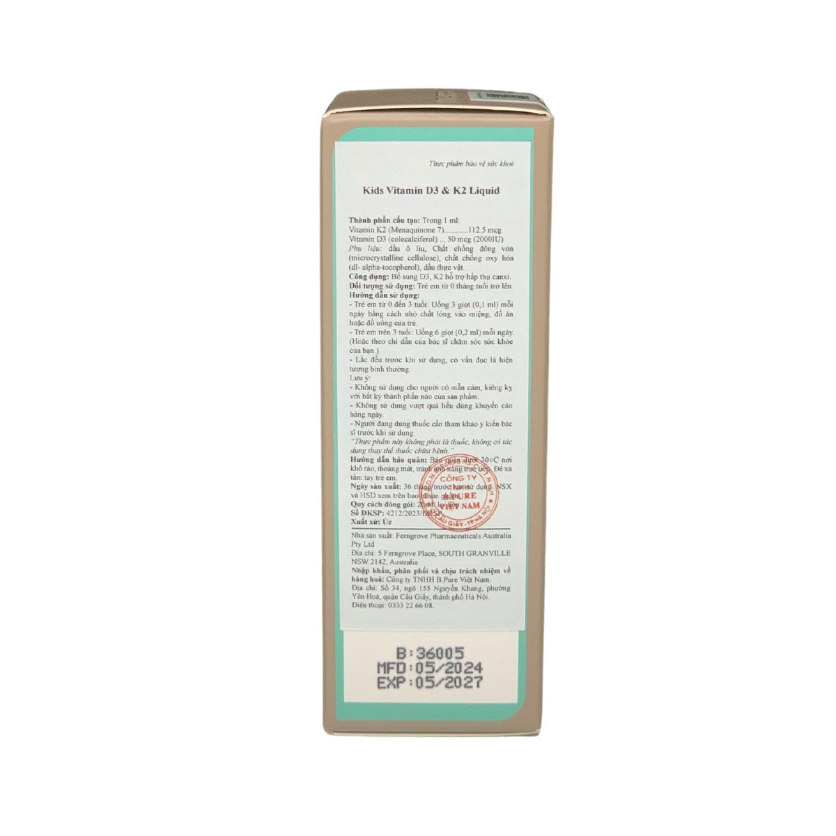 Kids Vitamin D3 & K2 Liquid là thực phẩm bảo vệ sức khỏe dạng lỏng, được đặc chế dành riêng cho trẻ em, nhằm bổ sung vitamin D3 và K2 – hai dưỡng chất thiết yếu cho sự phát triển xương chắc khỏe và hệ miễn dịch khỏe mạnh. Sản phẩm được bào chế dưới dạng dễ uống, giúp trẻ dễ dàng hấp thu các dưỡng chất cần thiết.