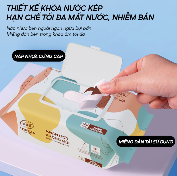 - Khăn giấy ướt Top Gia thiết kế khóa nước kép giúp hạn chế tối đa mất nước, nhiễm bẩn.