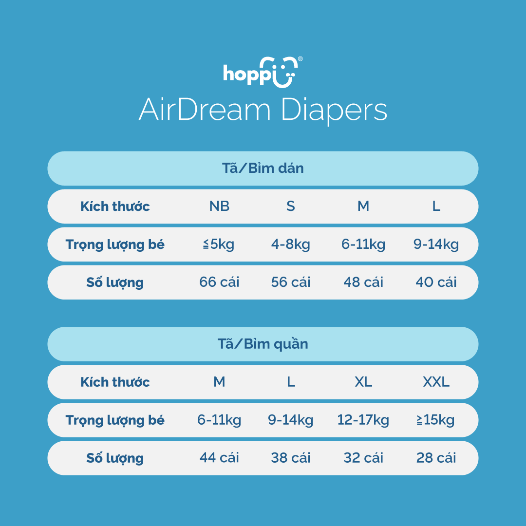 ✨Thùng 4 Gói Tã / bỉm quần Hoppi AirDream Diaper số lượng M 176 / L 152 / XL 128 / XXL 112 miếng