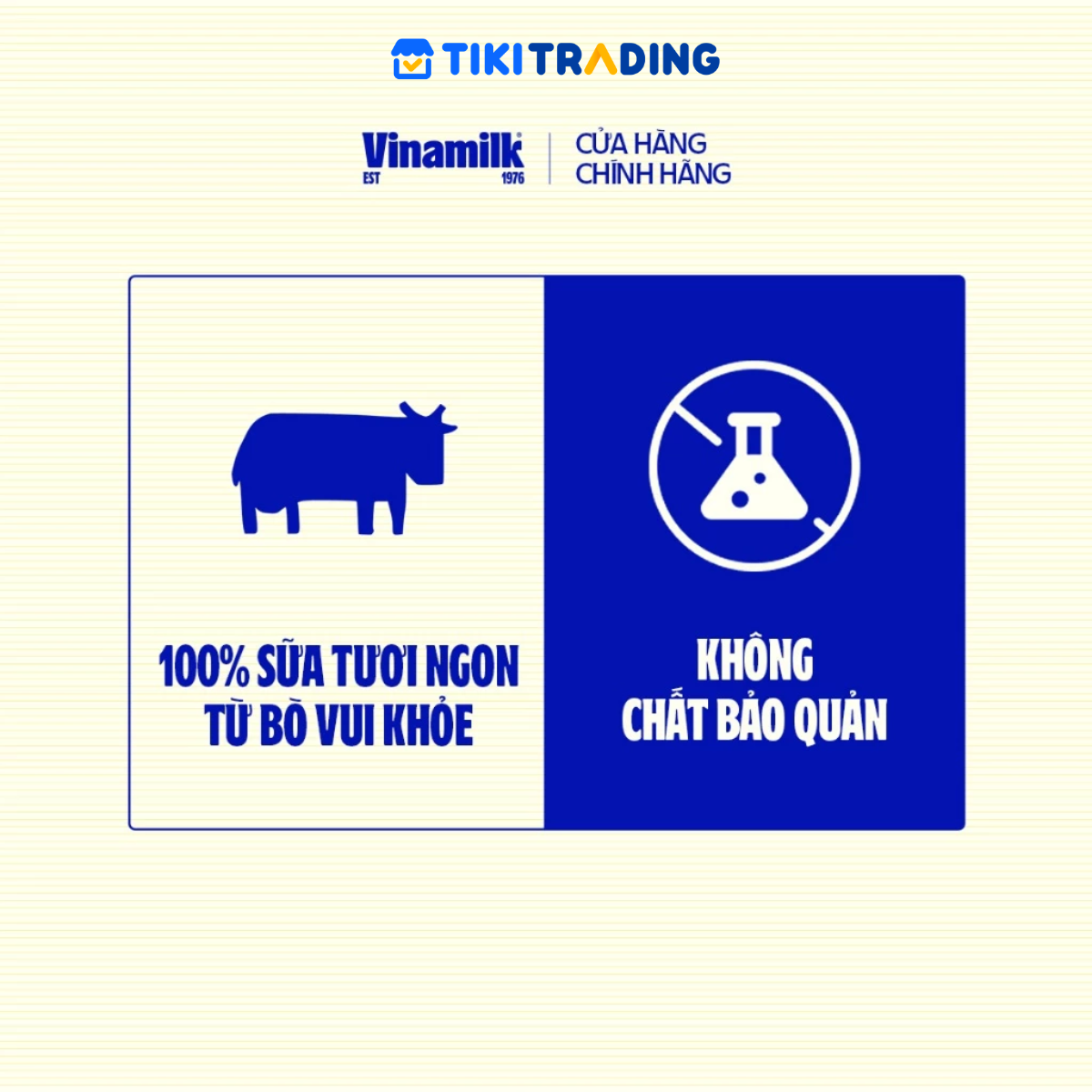 100% sữa tươi từ các bạn bò vui khoẻ Được vắt và đóng hộp mỗi ngày đồng thời trên hệ thống 8 nhà máy và 13 trang trại rộng khắp đất nước giúp sản phẩm