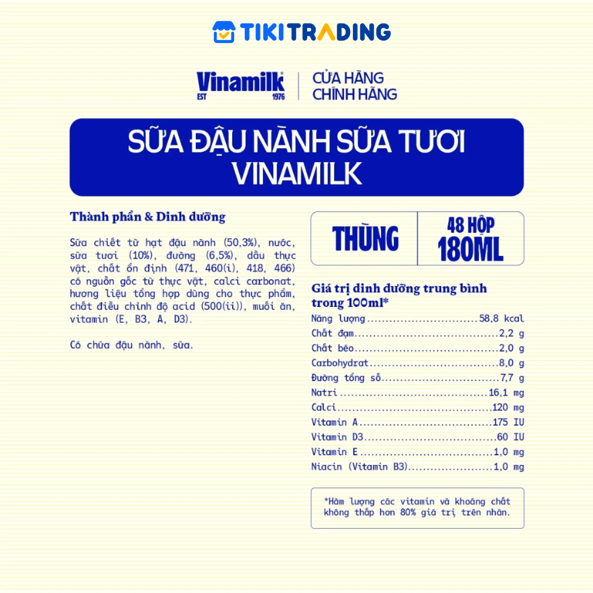 [CÓ THỂ NHẬN BB MỚI/CŨ] : Sữa đậu nành Tươi Vinamilk 180ml • Được bổ sung sữa tươi, giúp nạp năng lượng, giảm mệt mỏi. • Gấp đôi Canxi cho xương chắc khỏe • Hạt