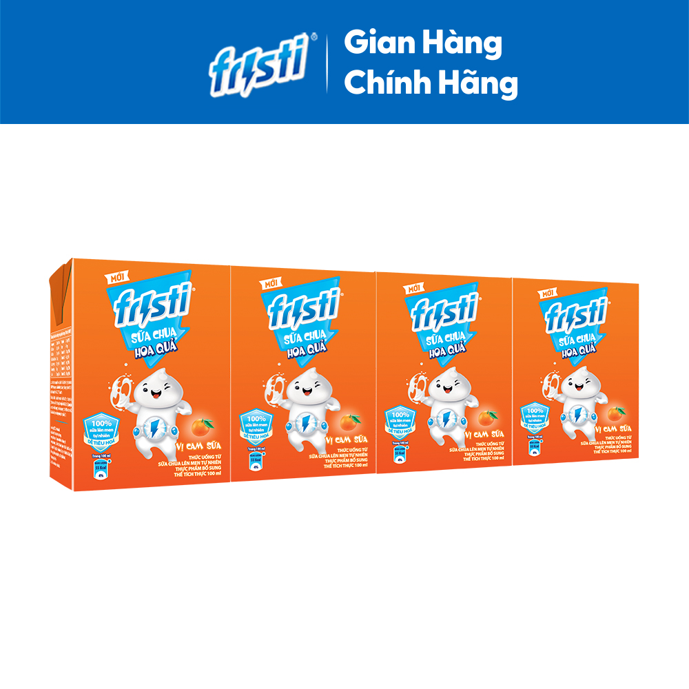 - Sữa Chua Uống Tiệt Trùng Fristi Hương Cam với các dưỡng chất từ sữa, vitamin A, B, D và khoáng chất là nguồn dinh dưỡng thiết yếu cho sự phát triển toàn diện của các