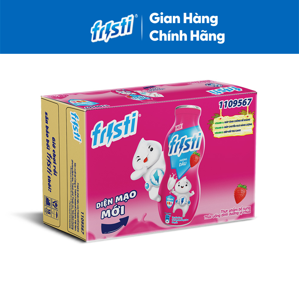 - Sữa Chua Uống Tiệt Trùng Fristi Hương Dâu với các dưỡng chất từ sữa, vitamin A, B, D và khoáng chất là nguồn dinh dưỡng thiết yếu cho sự phát triển toàn diện của các anh hùng nhí, giúp bé yêu thỏa sức cho trí tưởng tượng bay xa.