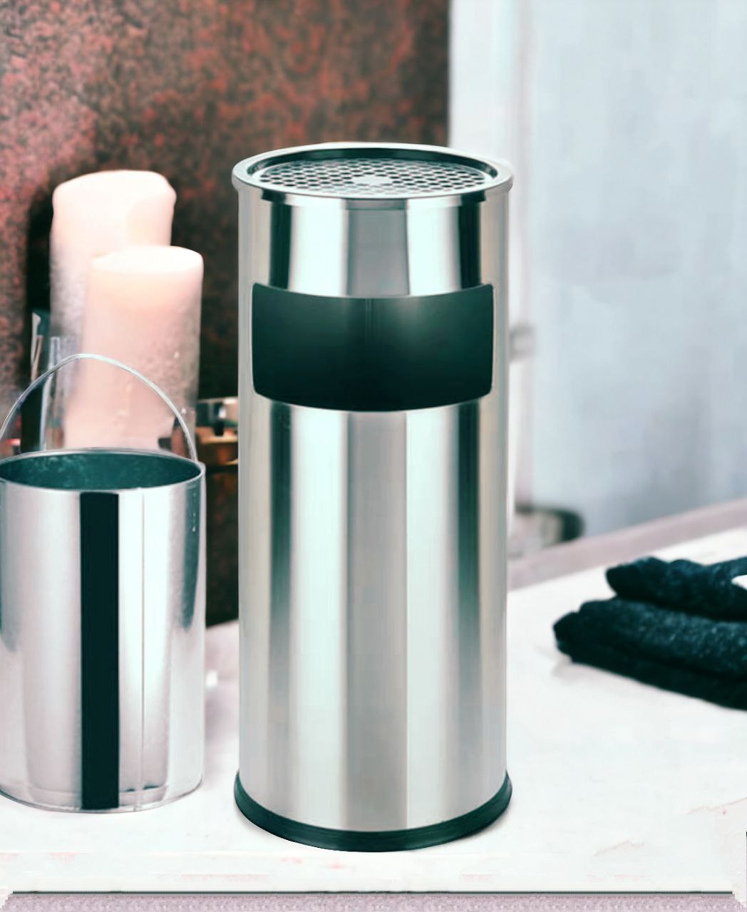 THÙNG RÁC INOX TRÒN CÓ GẠT TÀN A35-A - Thùng rác inox tròn có khay gạt tàn thuốc
