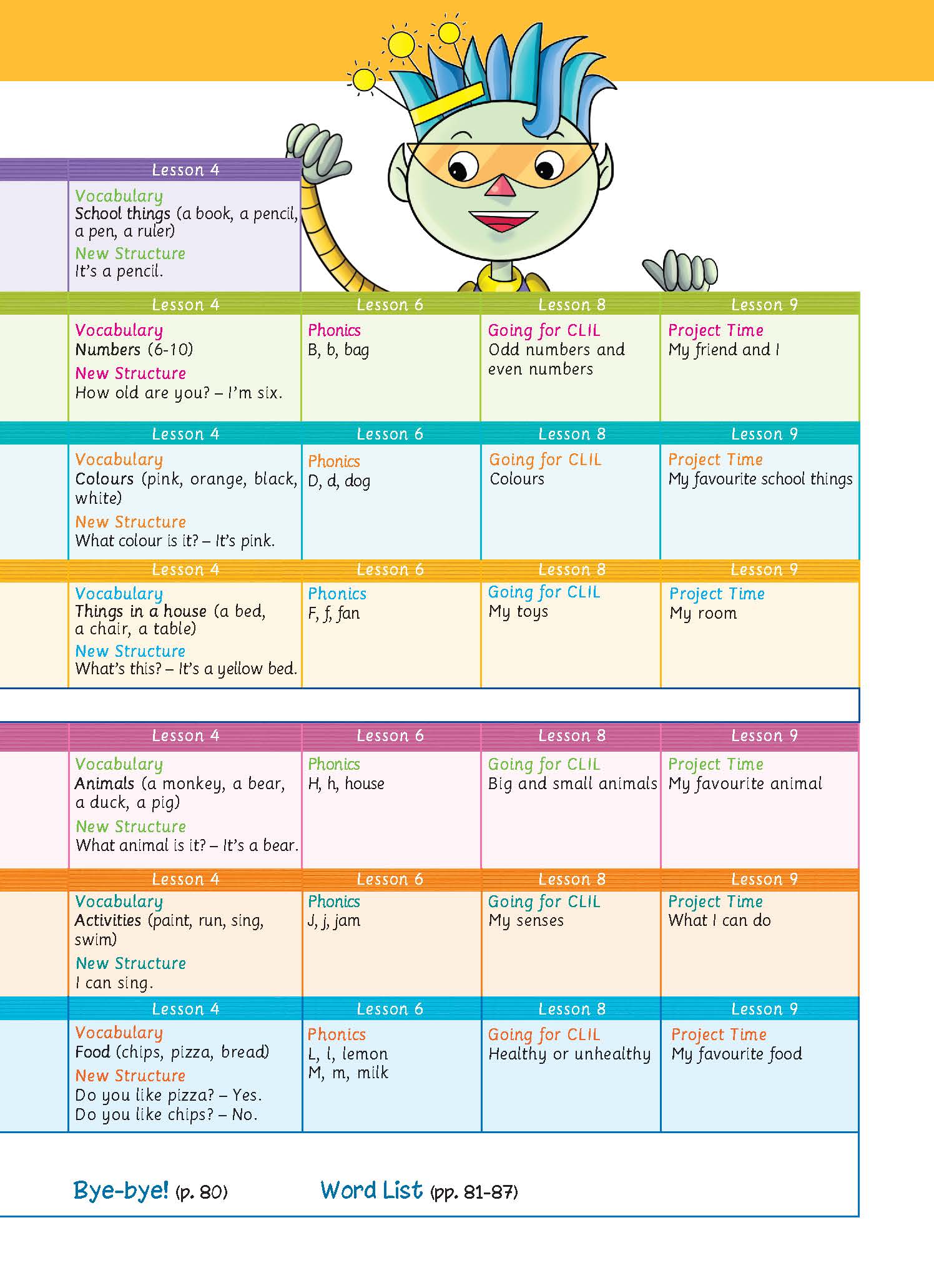 Sách: Learning English 4 - Dành Cho Học Sinh Lớp 4 NỘI DUNG VÀ CẤU TRÚC CỦA QUYỂN SÁCH : Bảng mục lục: Chỉ rõ các mục tiêu chính và trọng tâm của mỗi bài